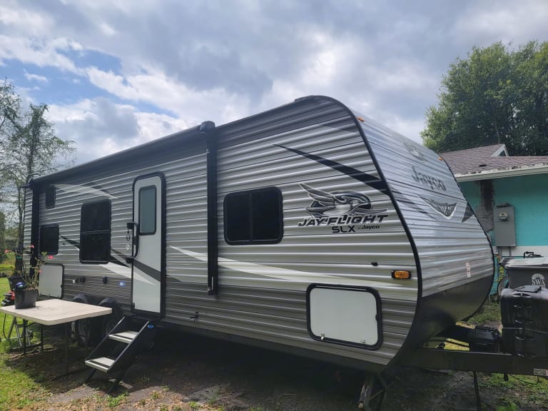 Cute clean & accommodating. It's brand new. Easy to use & very comfortable. Our Jayco hass every amenity needed. The 26ft travel trailer is perfect for family outings or anything outdoorsy. it sleeps up to 7 people! The Jayco Has a ton of storage everywhere. A queen bed up front & There's 2 full bunk beds in rear that can accommodate up to 270lbs each. Also has a futon couch pull out sleeper bed. You can share good dinners together in its dinette that can also serve as a bed. It has a 3 burner gas stove & oven, microwave, refrigerator, feeezer, coffee maker, outdoor shower, outdoor fridge, dinnerware is included. You have a 32" smart T.V. Radio w/inside & outside speakers. LED lighting strips. (There is a 30amp hook up needed to have at most locations of rental please confirm what you will need. We do offer generator services for primitive stays.) There is an outdoor fridge, shower, and BBQ Grill. We hope you enjoy our RV!No pets