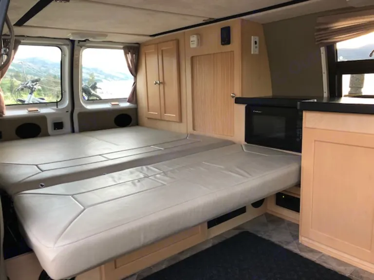 Standard size Ford E150 van, fully camper-ized at the Pleasure-Way factory. Sleeps 2 adults & 2 kids or 3 adults comfortably. Seatbelts for 5. Large lower and upper beds when the pop up roof is up, and bed platform is down. In the morning, lift the upper bed platform up and you have standing height to cook the bacon and eggs. This class-b camper van is the perfect machine for touring BC's West coast, stopping wherever and whenever you like. Boondocking is extra stealth with the pop up roof in the down position. Comes with everything necessary for dry camping. Built in water tank, furnace.