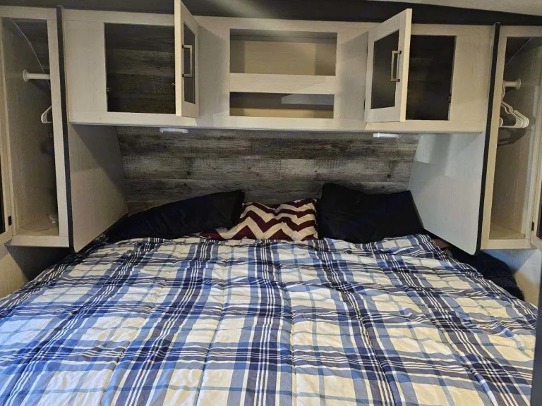2022 Mallard M27. King size bed in the master with a separate entrace/exit for those early mornings or late nights. 32 inch mounted TV for easy entertainment during those rainy days. Surround sound with exterior speakers for listening to your favorite music next to the fire! Table turns into a bed along with the couch that folds into a bed as well! Don't feel like sitting on the couch or at the table? Sit at one of the two rocking chairs in the back of the camper enjoying the views out the huge back window. Kitchen has a fridge/freezer, microwave, stove and oven! Need supplies or storage? No problem with a Huge storage access at the front of the camper! We hope you enjoy this camper as much as we do!Ce qui est inclus• Coffee Pot