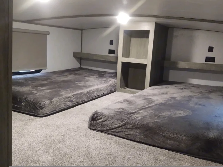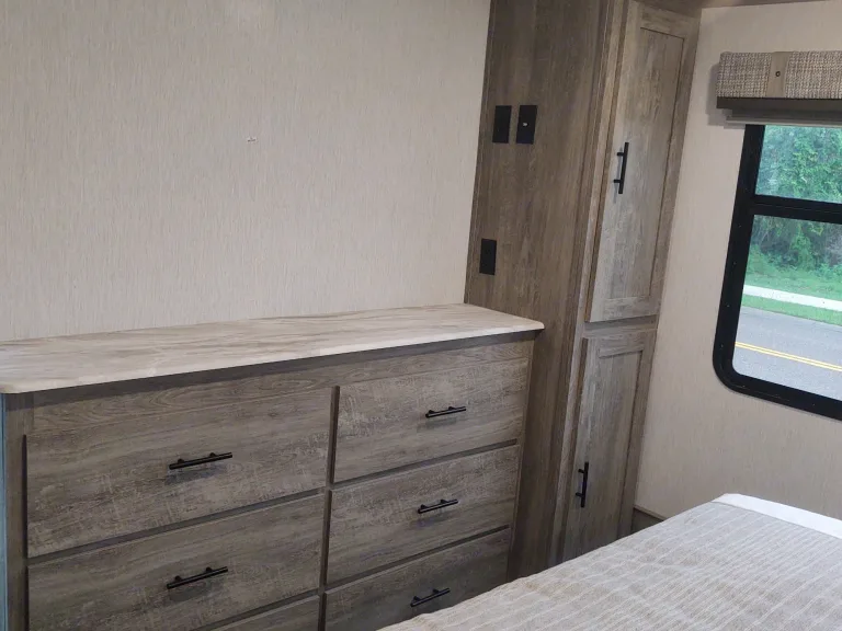 **50AMP Only** This beautiful home on wheels has 5 slide outs making it spacious and comfortable. This rig has a large living room fully stocked with a TV, games, an interior/exterior stereo, as well as 3 sofas. This living space converts to its own private area with blackout curtains to block off the room from the kitchen; ideal for multiple couples camping together. The kitchen has an island and table space to the right making cooking/prep work easier. It also has a full-size residential fridge and tons of storage. The kitchen is stocked with water, paper towels, plates, cups, silverware, and more! It has a full-size residential refrigerator, a dining room table for 4. The master bedroom is closed off by door with a built-in washer/dryer combo and storage under the bed as well as in the dresser/closet. The stairs lead to a loft that has 2 twin beds typically for children or those who like to sleep in without being disturbed. Ce qui est inclus6x camp chairs, linens, cookware, dishware, utensils, paper towels, soaps (dish, hair, body, hand), Delivery within 115mi radius. No self transportation. Campsite reservations are not included in rental price. RecommandationsDevils Den Prehistoric Natural Spring is just 2 hours from Orlando. You can camp right at the spring and be just a few miles from Cedar Lakes Woods & Gardens which feels like a fairy fantasy world as well as Twin Tails ranch, an Elephant sanctuary homing 2 Elephants that you can feed, ride, or get the full experience with their extreme encounter including all plus so much more.