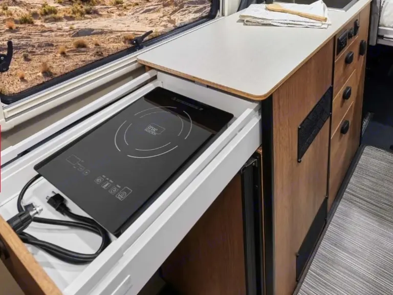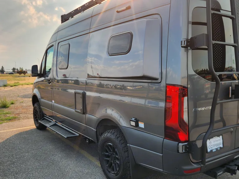 The REVEL has Solar, lithium battery storage, A/C, Elwell Hydronic diesel/electric heating system and (electric) fan unit. Off grid or campgrounds, the adventure is yours! In addition to solar, the onboard batteries are charged while driving to keep your adventure moving. Shore power is recommended for extended heating and A/C use.
