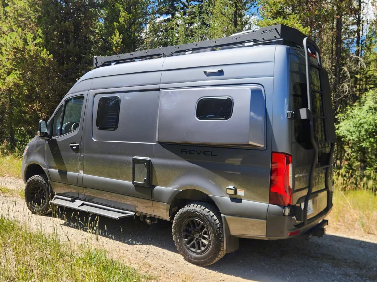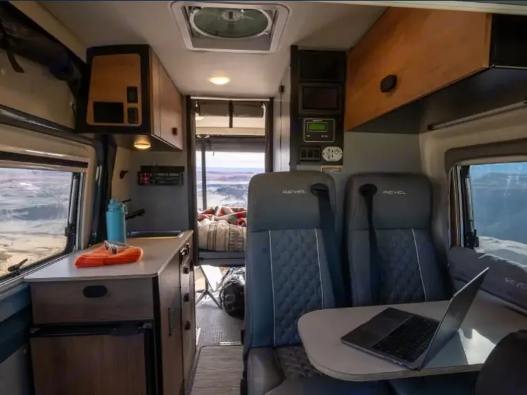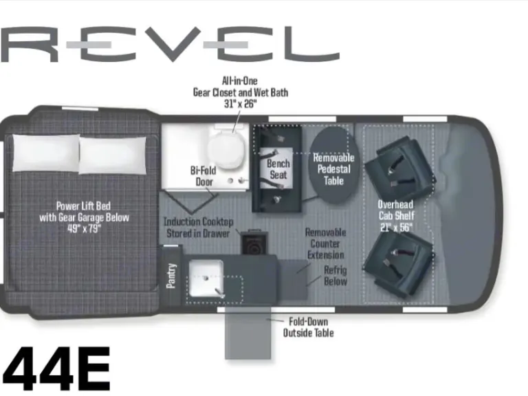 The Revel offers excellent onboard battery storage that works off solar and charge while driving for boondocking and off-grid adventures. For shore power, electric cable can accommodate 30 Amp input power. Clean and Grey Water capacity is 35g. The REVEL uses a portable toilet cassette which can be dumped at vaulted toilets as well as campground dump sites, hotels, etc.