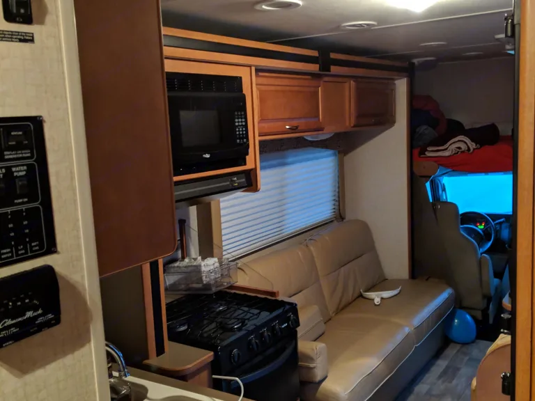 For a really cozy spot to play your favorite DVDs or nap, climb up over the driver's cab into the bird's nest sleeping area. Best spot in the RV if you ask my kids!