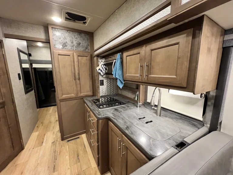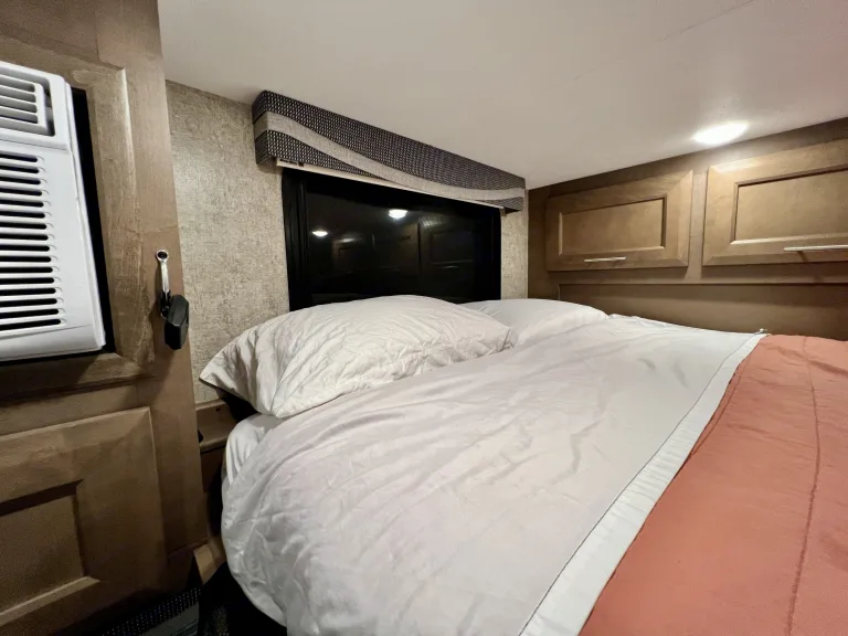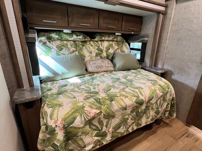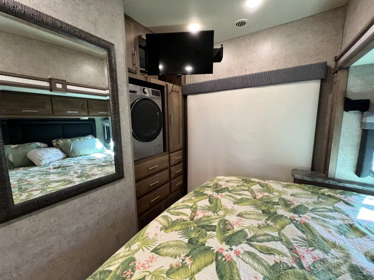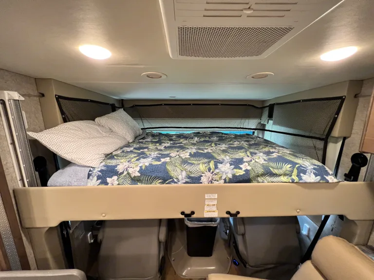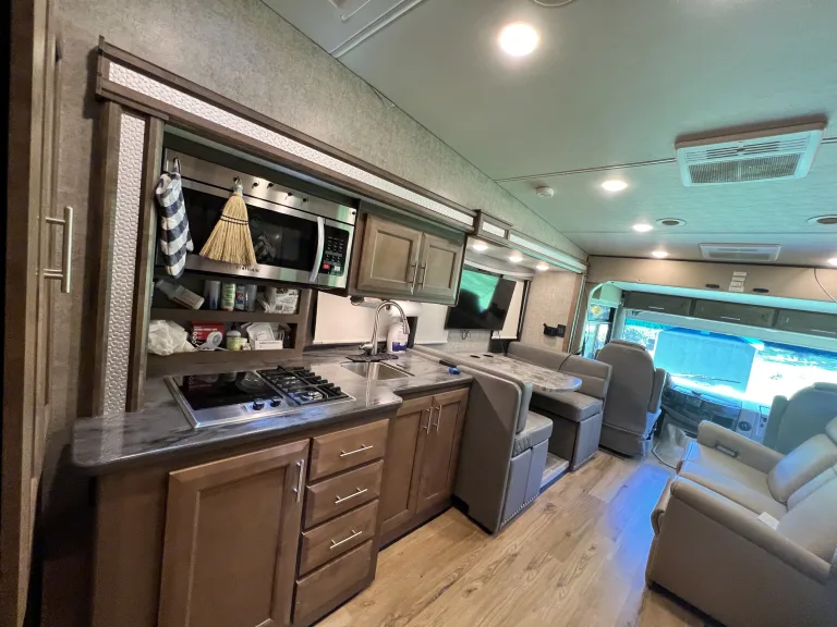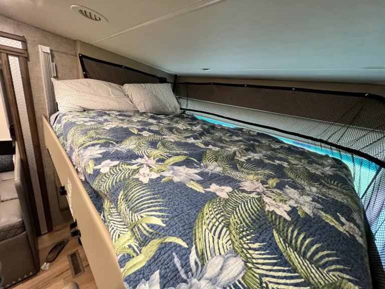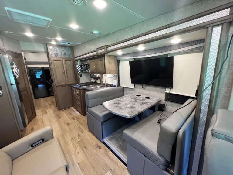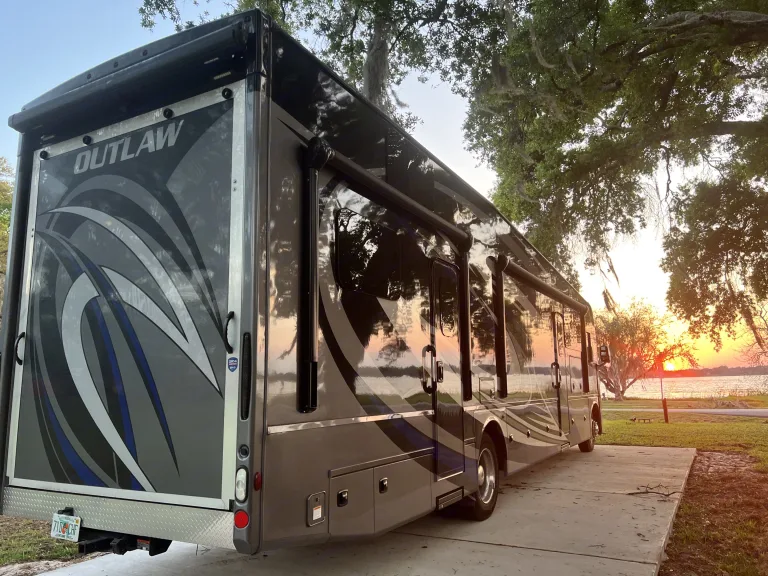 Casita Orange, our King bed 39ft Thor Outlaw 2022 Toy Hauler with an engine that has been tuned for optimal performance, and with many upgraded features, is available for your road-adventure(s) and camp-side fun.The coach is also ideal for racing & tailgate parties, concerts, festivals, Disney/Fort Wilderness, or just a long weekend at one of Central Florida's beaches, parks, or springs. Local delivery and pick-up are available.Casita Orange's cockpit is outfitted with an upgraded car-play enabled 6.75" touchscreen display for navigation & audio connected to speakers throughout the main coach and a 7" display for rear and side camera views.The coach features 4 Smart 4K TVs (1 in the main cabin, 1 in the primary bedroom, 1 in the Garage, and 1 outside near the main cabin door) and soundbars (1 in the main cabin, and 1 outside) for your streaming enjoyment. We also offer packages for In-motion DishTV, SiriusXM, and 5G wifi for an additional fee.In the main cabin, we upgraded the standard love seat to a power reclining loveseat with a center drop-down armrest complete with USB and cup holders! Main cabin A/C silencers have been installed so you still get a good night's sleep on those hot & humid nights with the AC cranked.The kitchen has a Rodi system with a dedicated faucet, for the cleanest drinking water possible and since we hate doing dishes we have a dishwasher installed in the storage right outside the door.The Primary bedroom features a 10-inch cool gel memory foam & hybrid coils king mattress, and 1000 tc Egyptian cotton sheets to lull you to sleep and that room includes the washer/dryer combo to keep your clothes looking sharp.Additional beds include the Drop-down Overhead full-sized bunk with a pillow top 10" comfort foam & pocket spring hybrid mattress, & cotton percale sheets, the Garage Sky-bunk with queen-sized mattress & cotton percale sheets, the Garage Dual Jackknife queen-sized fold-down and the Dining Table full-sized fold-down. Bedding and pillows will be provided for the fold-down options upon request for no cost.We offer add-ons like the Solo stove Bonfire firepit with cast iron griddle cooking bundle for great flame-grilled meat or impossible (we don't judge) burgers, a 16-panel doggy camping 40" fence to keep your furry friend from chasing squirrels around the campsite, and a SolidStep 30" Quad Step for easy access to the back deck from outside. We can accommodate pretty much any additional add-on requests, just ask and we will see if we can make it happen.