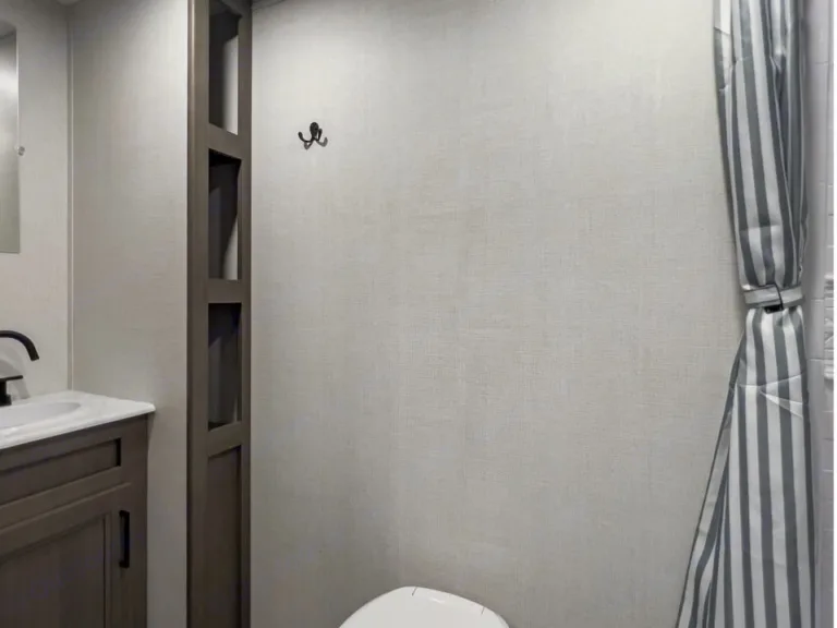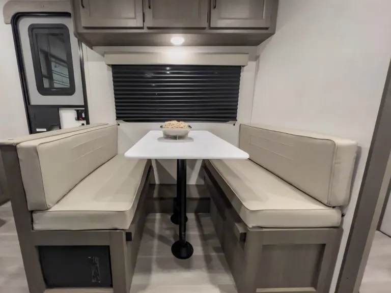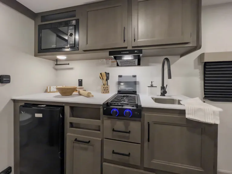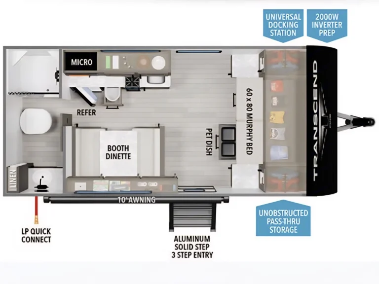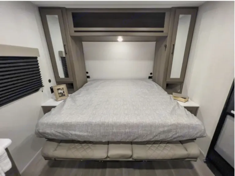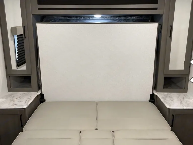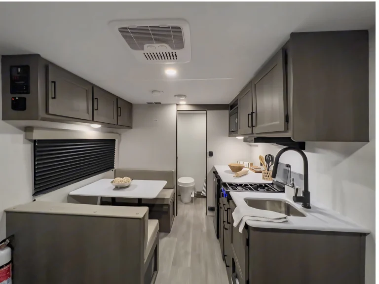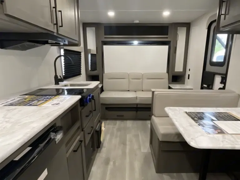 Showcases a queen Murphy bed up front and booth dinette, designed to sleep around 3–4 comfortably.Interior Comfort & FeaturesFull kitchen with 2-burner stove, microwave, 12V refrigerator, deep stainless sink, solid wood drawers, and residential-style countertops for home-like comfort.Compact but well-appointed bathroom: standard shower, foot-flush toilet, and a vanity—ideal for quick refreshes.Entertainment-ready with JBL stereo and interior/exterior speakers, plus power awning (with LED or Fusion lighting) providing shade and ambiance.Interior Comfort & FeaturesFull kitchen with 2-burner stove, microwave, 12V refrigerator, deep stainless sink, solid wood drawers, and residential-style countertops for home-like comfort.Compact but well-appointed bathroom: standard shower, foot-flush toilet, and a vanity—ideal for quick refreshes.Entertainment-ready with JBL stereo and interior/exterior speakers, plus power awning (with LED or Fusion lighting) providing shade and ambiance.