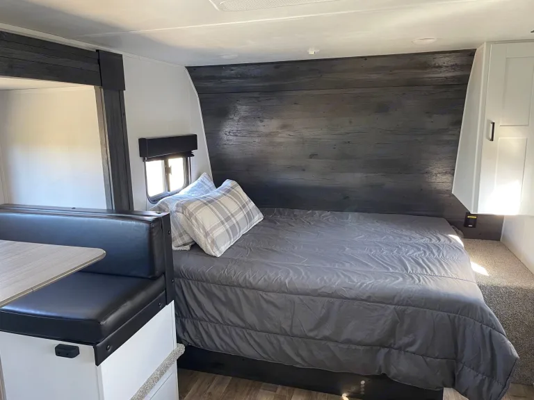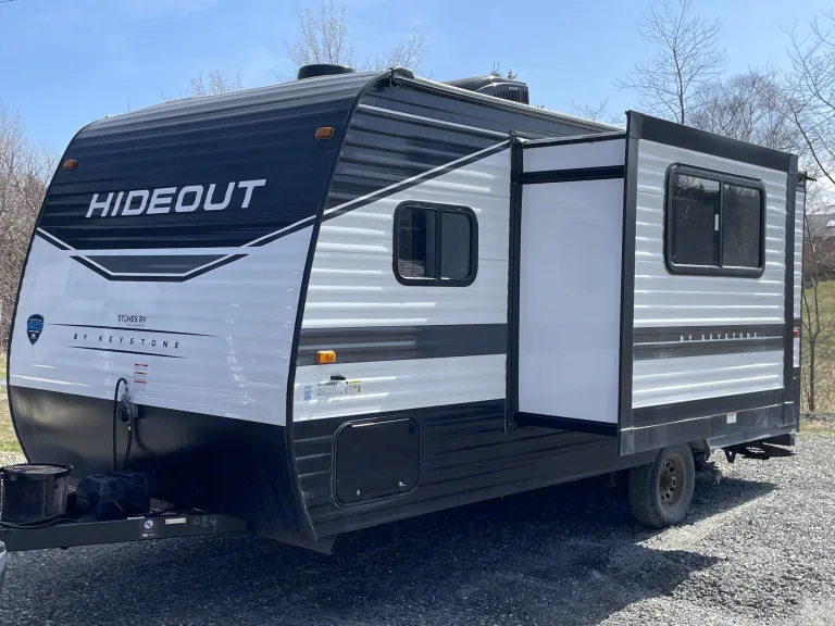 New in 2022 and very lightly used. Our camper is comfy and clean and perfect for your 2025 vacation getaway. Has a master double bed, dining table conversion bed and a set of bunk beds. It comfortably sleeps two adults and 2/3 kids. It comes fully equipped with a propane stove, propane/electric fridge/freezer, microwave, Bluetooth speaker, interior shower, toilet, sink, A/C and heater. All dishware, silverware, cookware and kitchen and bath necessities including towels. An electric awning with LED outdoor lights is also included. Small dogs under 30lbs are welcome. Not suitable for larger dogs.Ce qui est inclusA small portable BBQ is available as well as 4 camping chairs RecommandationsPlease review out ‘Add on section’