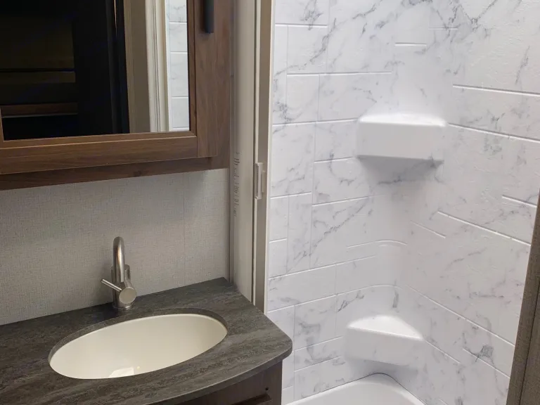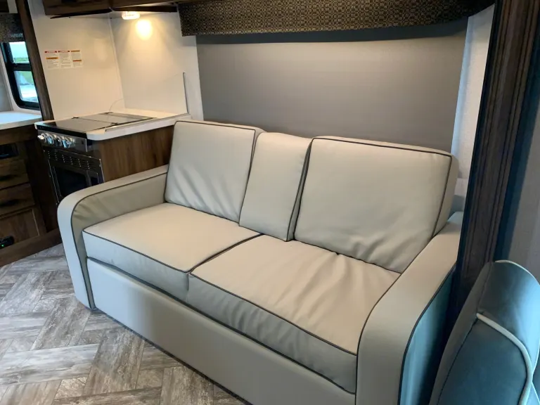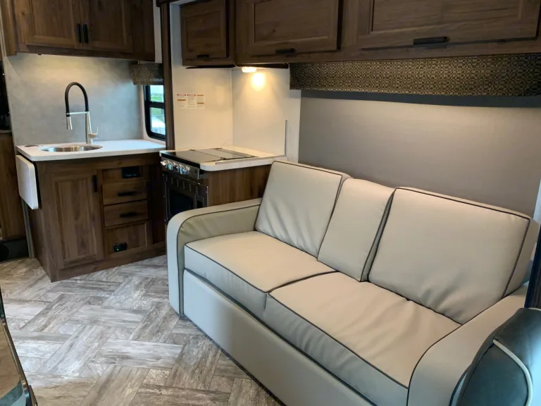 The 3250Dsle is a bunkhouse model. There's a 28" x 72" flip-down bunk above with a kids' sofa sleeper that folds out to a bed below. The adults can enjoy their own sleeping area in the rear. The bathroom offers a 24" x 32" shower with tub, along with linen storage. The kitchen is set up to maximize space, while a booth dinette and sofa provide additional seating and sleeping areas. In front, a 60" x 80" cab over bunk gives you even more space! Built on the Ford E450 Chassis.