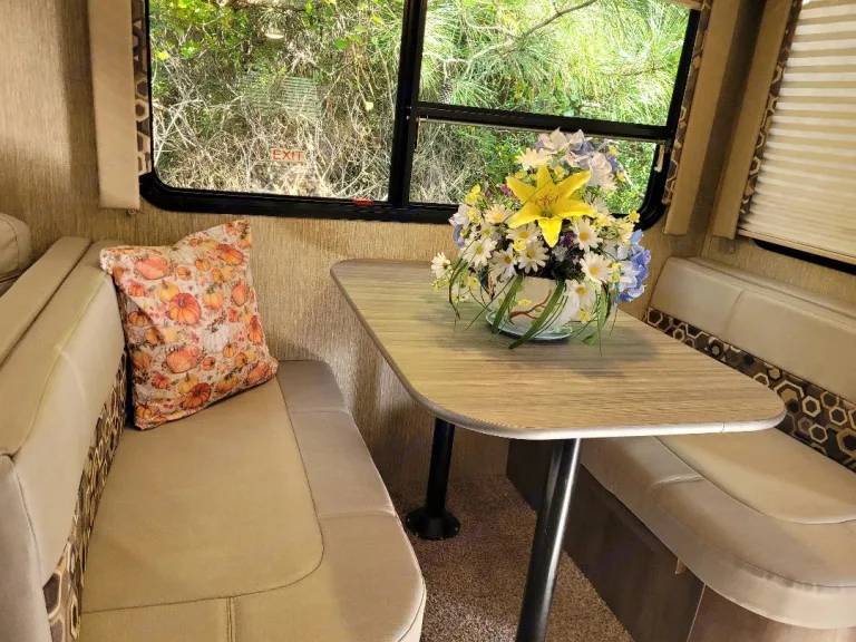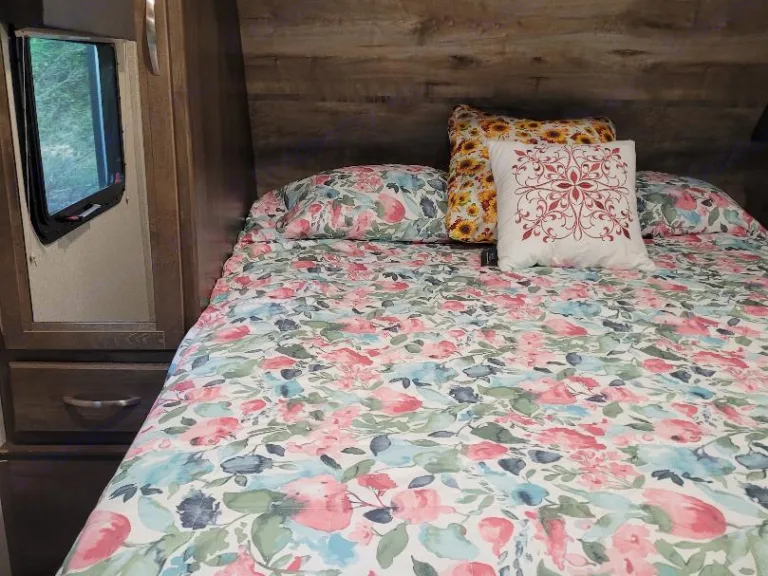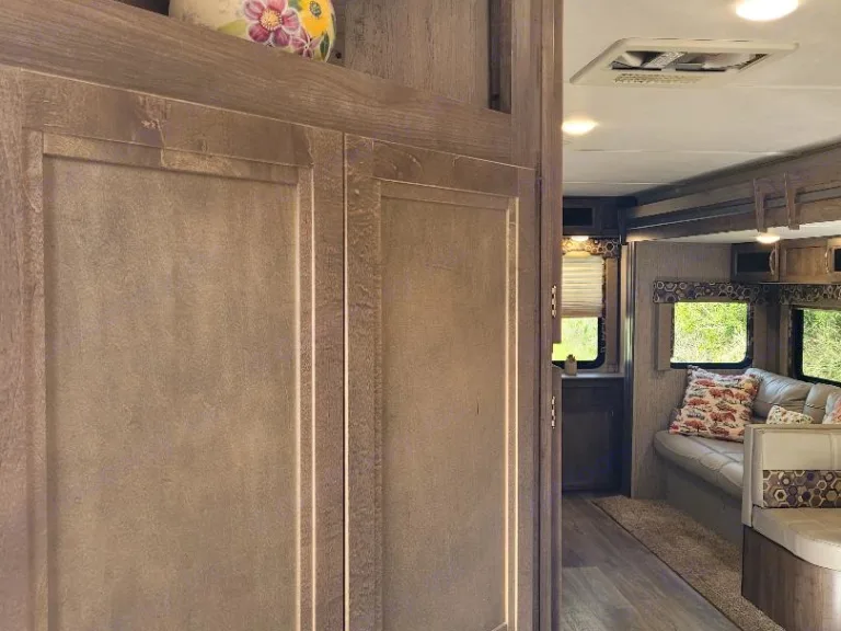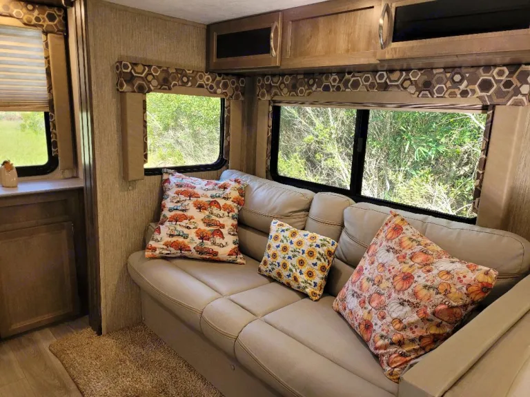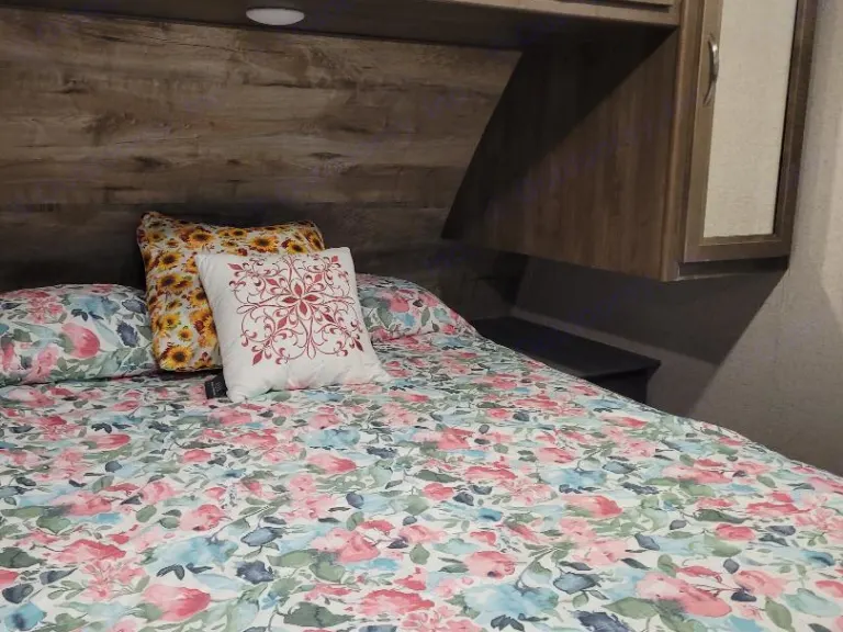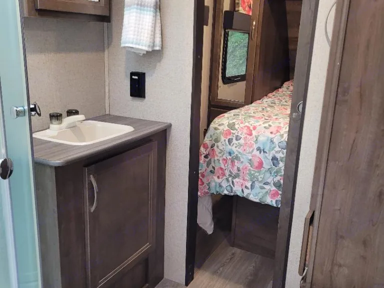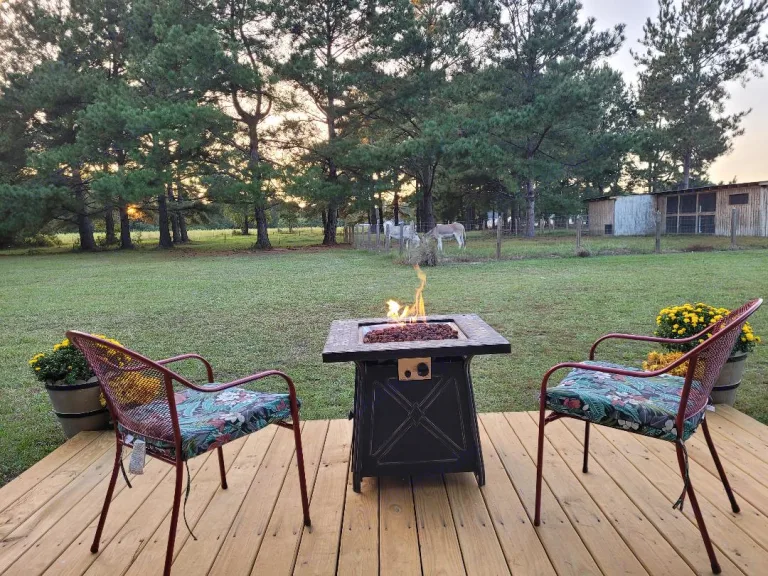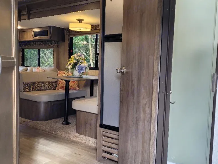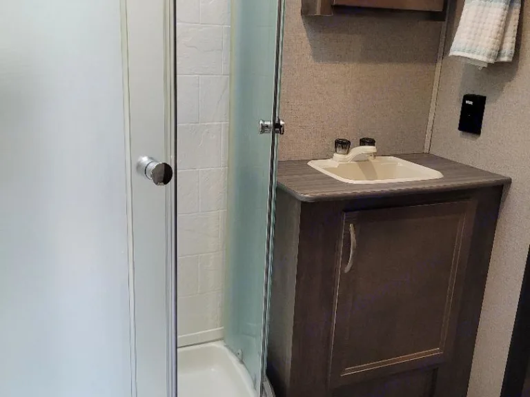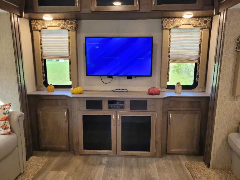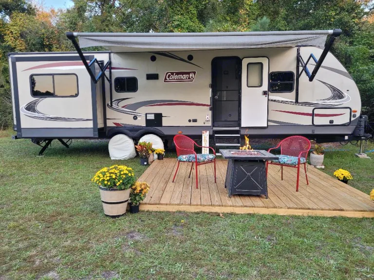 Has fully working awning that you control. 12 x 12 wood deck, with chairs and a gas grill or wood (whichever you prefer); Gas BBQ included, outdoor heater if needed. Smart TV/DVD/CD with outdoor speakers, inside shower, and an outside shower.o