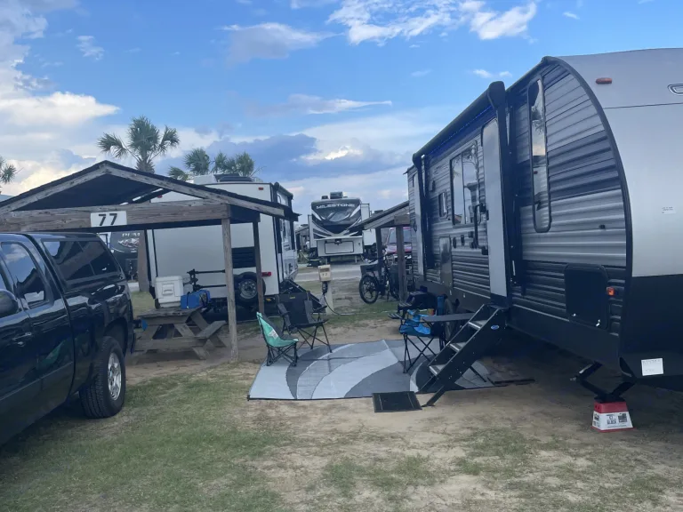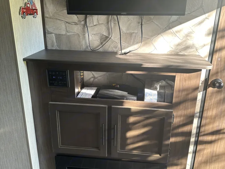 Thank you for considering my unique camper! It has a very social layout with the sofa and dinning table making a circle and nice open area inside. Ideal for gathering inside and out. Fireplace is pretty and can do some heating if needed or turn on the propane heater. You can link your phone to the stereo to stream music inside and/or out. TV with streaming ability and dvd player. Outside shower for your feet. Extra entry if you just want to use the bathroom. The manufacturer claims it sleeps 10 but it would sleep 5 adults comfortably. I’m sure you’ll enjoy it Ce qui est inclusThere are outdoor carpets and chairs to put under the awning and the outside kitchen in one of the storage cubbies and basic kitchen items, coffee maker, broom, vacuum and cleaning equipment inside. Sheets for the beds. Just treat it well and put everything back the way you found it. Best you can, please.RecommandationsIf you are familiar with campers you know it’s important to handle the septic system with care. If you select a site for the camper that does not have a septic hook up. Add the dump fee. It’s got about 30 gals per holding tank black and gray, so you’ll fill them up in a day or two if you are not careful. If it’s cold, use the electric fireplace for heat before the gas if you can manage. The AC gets it nice and cool if it’s hot. It’s a 30 amp system but can run off 110 with an adapter but that’s not enough power for the AC. Ask questions if you need guidance hereAutres points à signalerNo smoking inside and just treat it with care. Everything inside is available for use but if you break it you bought it. Please, bring it back the way you found it and hope you enjoy your time in it. It’s very comfortable.