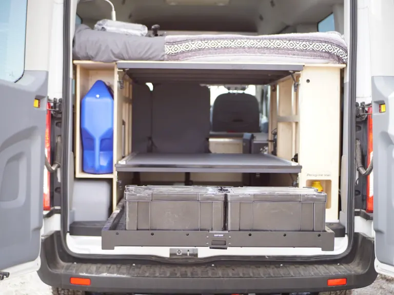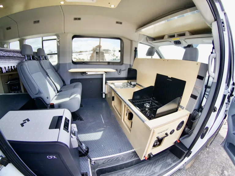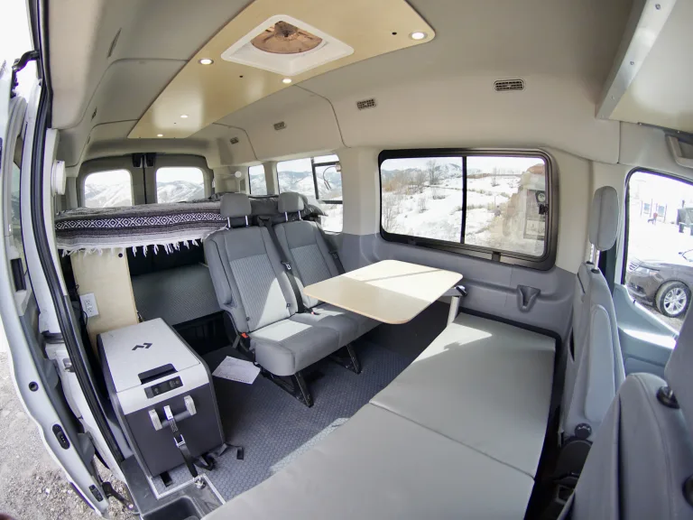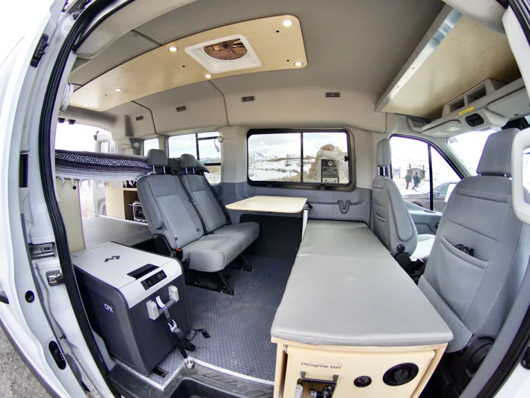 Ferdinand Magellan is perfect rig for your next adventure. It is a brand new professional conversion by Peregrine Vans in a 2019 mid-roof Ford Transit Van with only 30k miles. This is the perfect size to feel roomy inside and not drive like a sailboat down the highway. Ferdi seats 5 in proper seats with belts, sleeps 4 comfortably plus 1 child. Great for families or 2 couples. Equipped with a kitchen, solar power station for lights, refrigerator, and ventilation fan and gas powered heater. Ladder up to deck on roof. Great for watching fireworks and sunsets. Loads of storage on two shelves under the queen bed. Pull out bins to securely store your gear.1 queen-size bed in the cab, and a hutch rooftop tent with a built-in mattress, full size to sleep 2. Has another platform that can be used for storage that doubles as a platform for another kids mattress (under 5 foot tall).