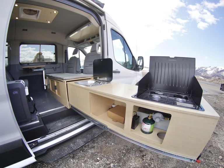 Fully self-contained "pull out" kitchen with Dometic sink, 2 burner cooktop, 5-gallon freshwater/grey water tanks, and dedicated battery supply. The kitchen box can also be used inside during inclement/cold weather via the folding bench seat top. Can also be used as an extra sleeping spot for kids under 5'2"