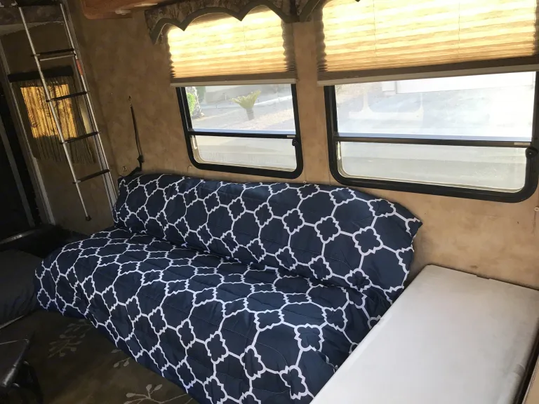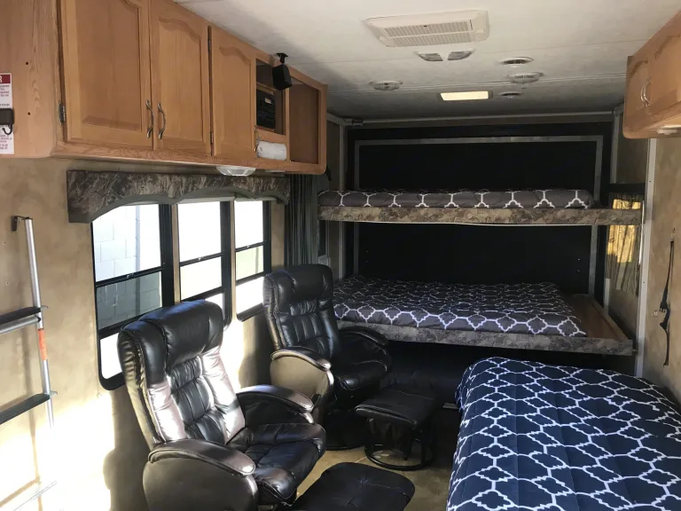 34' Toy Hauler, sleeps 9, fits all 4 person RZR or The bigger Can AM Max.I'll provide a 2" Equalizer 4-point hitch that fits a standard 2" receiver so the toy hauler is easier to pull, provides a better experience in reducing highway sway.Also... Comes with all the comforts of home; including flatware, pots, pans, toaster, coffee maker, cups & bedding (sheets & comforters), bring your own pillows and food & enjoy your trip.You will need a 3/4 ton pickup to tow this bad boy, Rear-Air helper springs recommended.Purple Queen bed in the front that is super comfortable, sleeps 2Has 2 Queen beds in the back on a power raise & lowering track, sleeps 2 eachHas a fold-down Full couch, sleeps 1-2Also has a Twin or Queen tall inflatable bed, sleeps 1 or 2 (if needed, please ask).Dry Weight: 8,445 lbs.