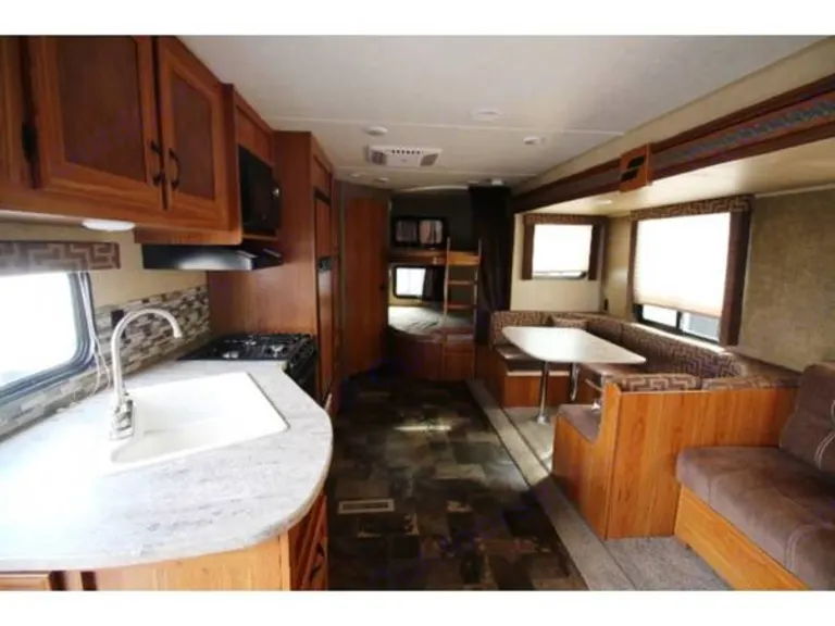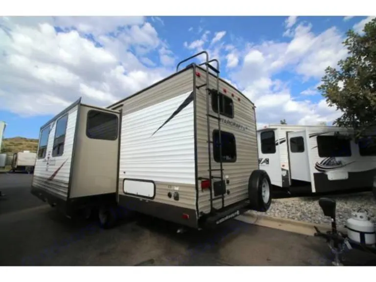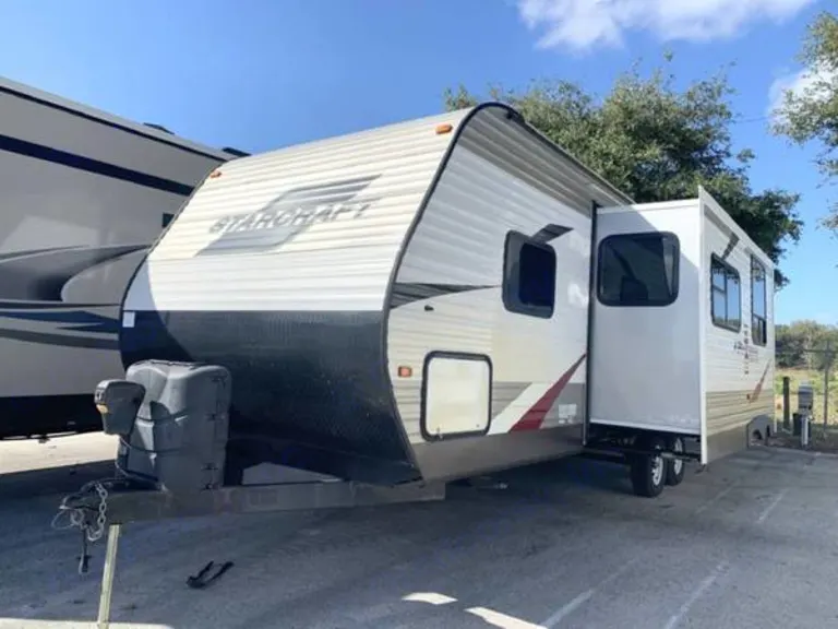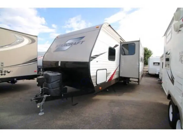 2017 StarCraft 27BHS. Trailer weighs 6300 pounds. 1/2 ton towable with truck or SUV. Full kitchen and bathroom. 45 gallon water tank. Large rear bunkbeds and front private queen bed. Couch and dinette booth both make into full beds. Heat and AC work great. Bathroom has private entrance. Electric awning and tongue jack. TV with DVD player. Generator and weight distribution hitch available.