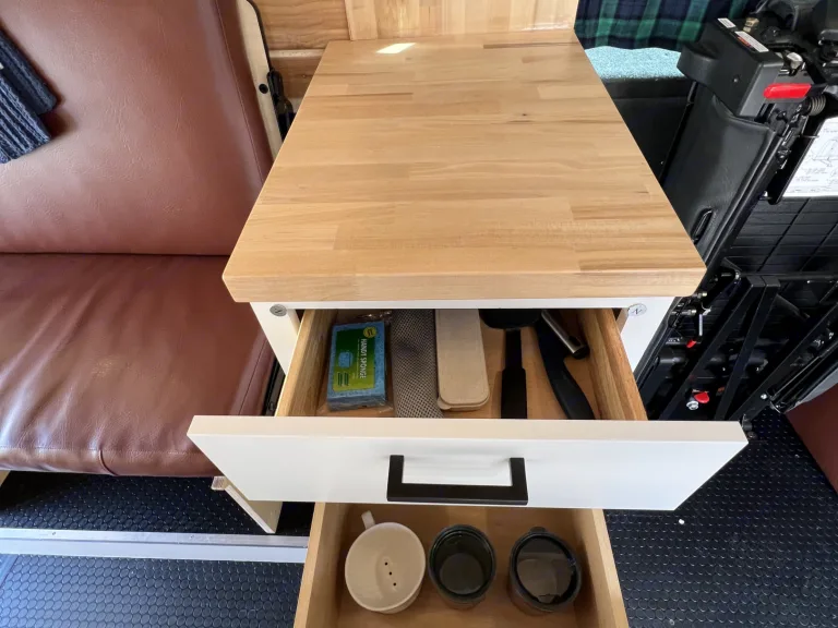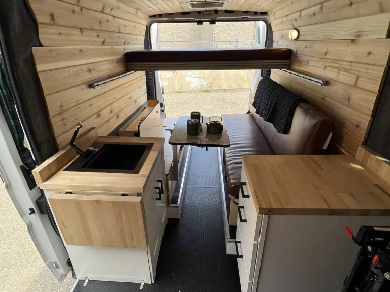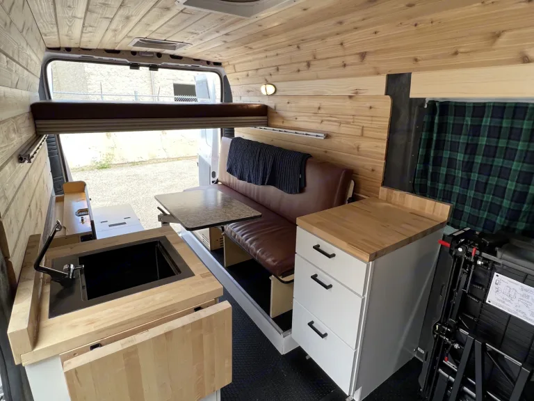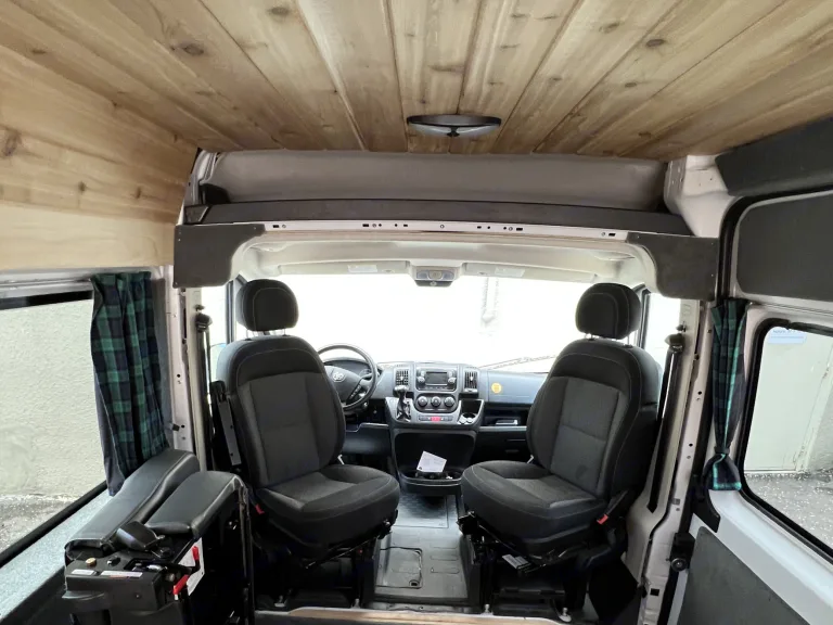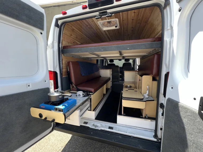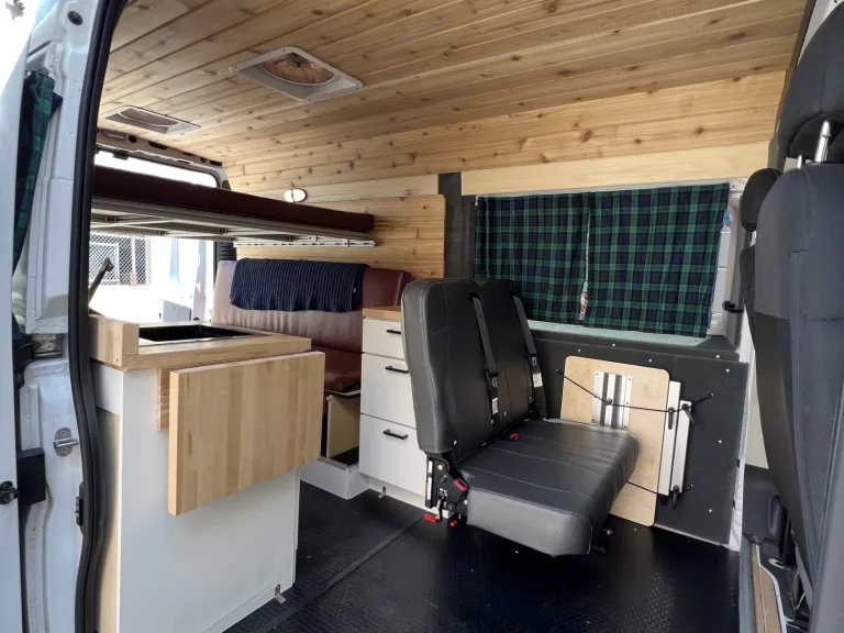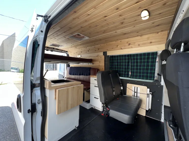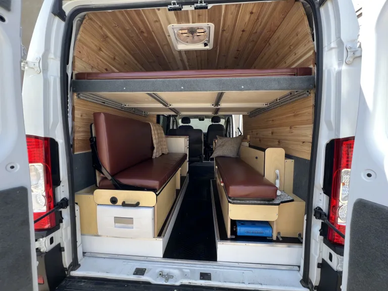 Our latest 4 person build has the ultimate flexibility for your travels. The four seats allow for ample seating space while driving as well as the ability to add car seats to the second row seats for smaller children. The two front seats swivel so when parked you can enjoy an indoor seating space. The second row of seats completely fold up and out of your way. This layout also includes two full size beds for sleeping (the top bunk is completely removable). The lower bed transforms into a couch during the day. There is the added option to cook inside or out the back with a fully stocked kitchen to whip up some delicious meals. Two ceiling fans also add some extra comfort sleeping during those hot summer nights.