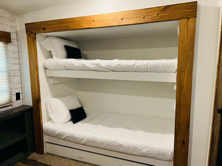 The Greystone Bunkhouse has 4 slide outs and is equipped with 1 full bathroom with a shower, sink, and toilet, a second bathroom with a sink and toilet that is accessible from the outside. It also has 3 twin sized bunks beds, and a queen master bedroom. There are plush memory foam mattress, toppers on all beds!