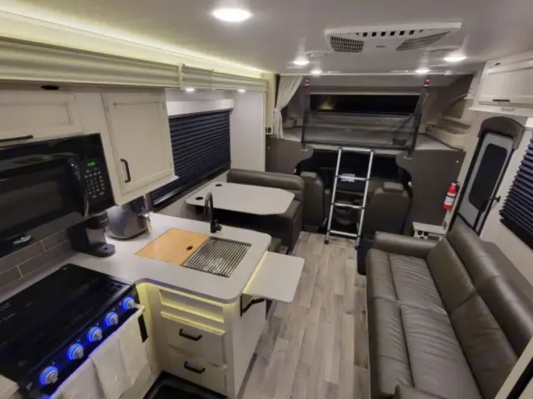 This RV makes your traveling worries disappear. Complete with full amenities including full kitchen. Spacious sleeping areas and sitting areas. You’ve also got access to outdoor entertainment with speakers for music , outdoor tv for football games all under the lights on the awning. Stress free set up as this camper will level itself so not struggling with those jacks! Just push a few buttons and your all set for your adventure!Great for families! Ce qui est inclus• All basic kitchen utensils (silverware, pots, pans)