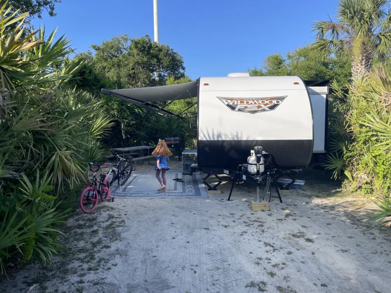 Our Trailer is a small Bunkhouse model. You have 2 RV double bunks in the back as well as an RV Queen murphy bed up front. The Dinette can also be converted to a double bed as well. While it can sleep up to 8 we would recommend no more than 5 or 6. You'll find charging ports all over if you still need to be connected. We include linens, a small outdoor kitchen, RV rugs for outside and plenty of chairs. Youll love the cozy feel inside and it's the perfect size for many older campgrounds or state parks. If you're newer to towing an RV the small size makes it really manuevarable and easy to get into the tightest spots. We do include a Curt Wireless Bluetooth trailer brake controller. A Curt Weight distributing hitch is also availabe at no charge.Ce qui est inclusWe include Linens, 4 rolls of RV toilet paper, 5 camping chairs, towell drying rack, as well as a fully outfitted kitchen with dishes, utensils, pots etc. RecommandationsWe would recommend any of our local state parks and of course Fort Wilderness and Camp Margaritaville offer fantastic Glamping opportunities. Also if your new to RV'ing please feel free to ask questions. The only dumb question is the one you don't ask.Autres points à signalerReturn Unit clean