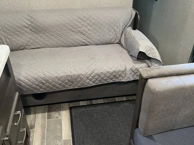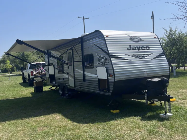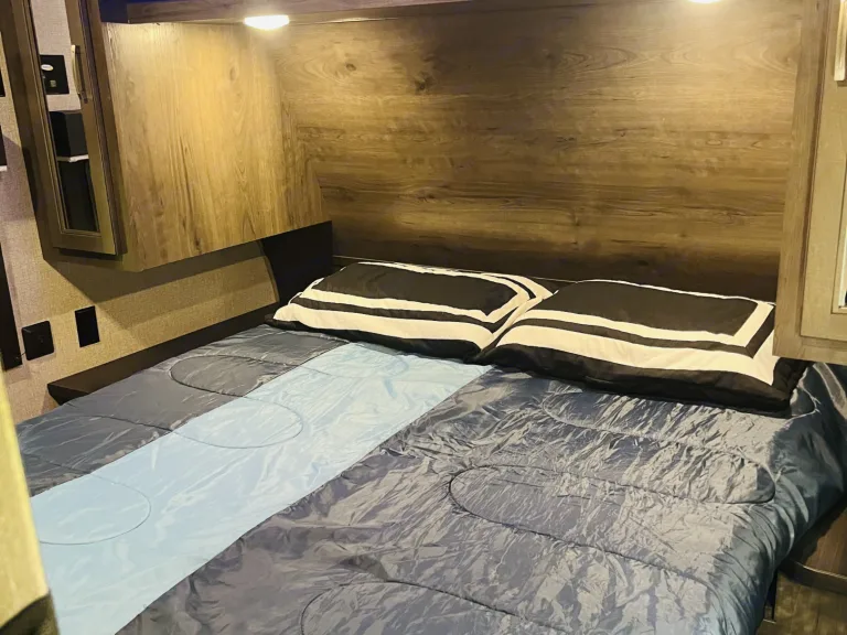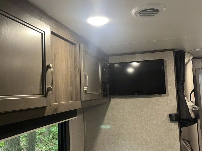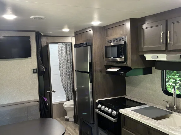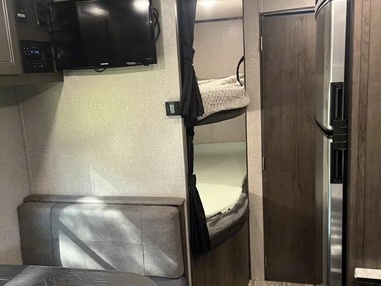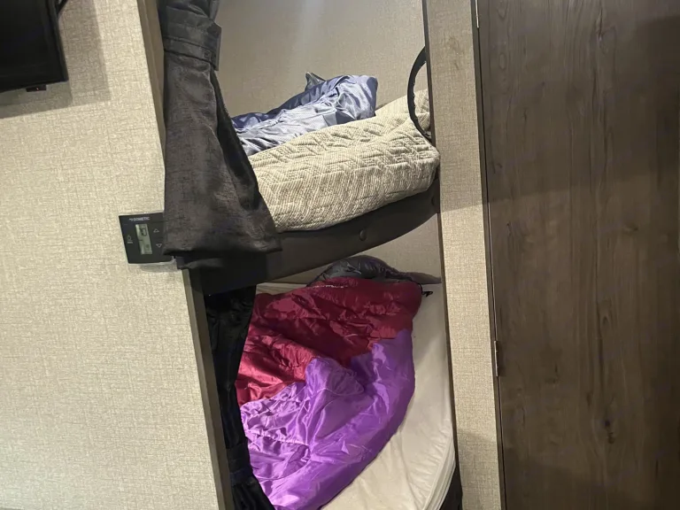 This is a light camper, basically brand new. There is a queen bedroom that is closed off from the rest of the camper with a door. It comes with 2 bunk beds that can sleep 2 people on each one. A pull out couch. I have also added 2 tvs. This will be great for your family. I would love to host you! Ce qui est inclus2 Camping chairs. I have fresh bedding and 2 pillows for the master bedroom. Toaster, blue broom and dust pan, mop bucket, and some plates,bowls and silverware.Autres points à signalerNo smoking inside the camper. Please put the awning in before bed at night. And if it’s windy do not open it as it could tear and damage the awning. If close to a fire please put it in also as it could catch fire. Thank you for your understanding.