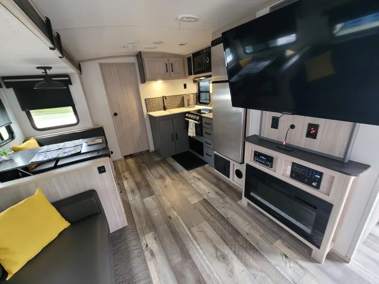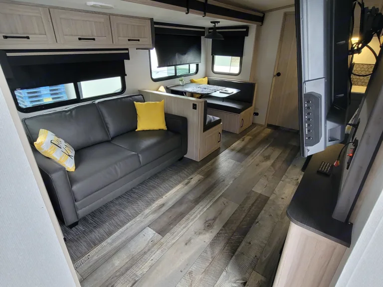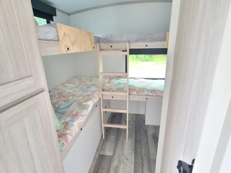 Free Delivery & Setup – within 25 miles!Modern, spacious, and perfect for families or groups. Sleeps up to 10 with a private queen bedroom, quad bunkroom, pull-out sofa, convertible dinette, and 1.5 baths.Outdoor Living:Power awning, 2 bamboo rugs & 2 chairs
