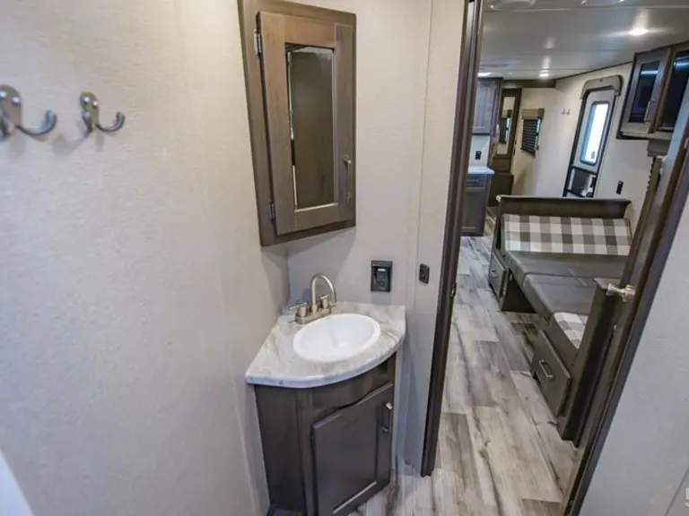 - Numerous USB ports for all your gadgets- **Bathroom Luxuries**: A full rear bath with a shower, toilet, and sink, all designed with comfort in mind, ensuring your camping experience feels like a home away from home.- **Durability and Design**: Built with a strong metal exterior and insulated walls for lasting protection and comfort, this travel trailer is as durable as it is beautiful.**Why Rent This Trailer?**- **Fully Equipped**: Everything from bedding to cookware, ensuring you travel light and live large.