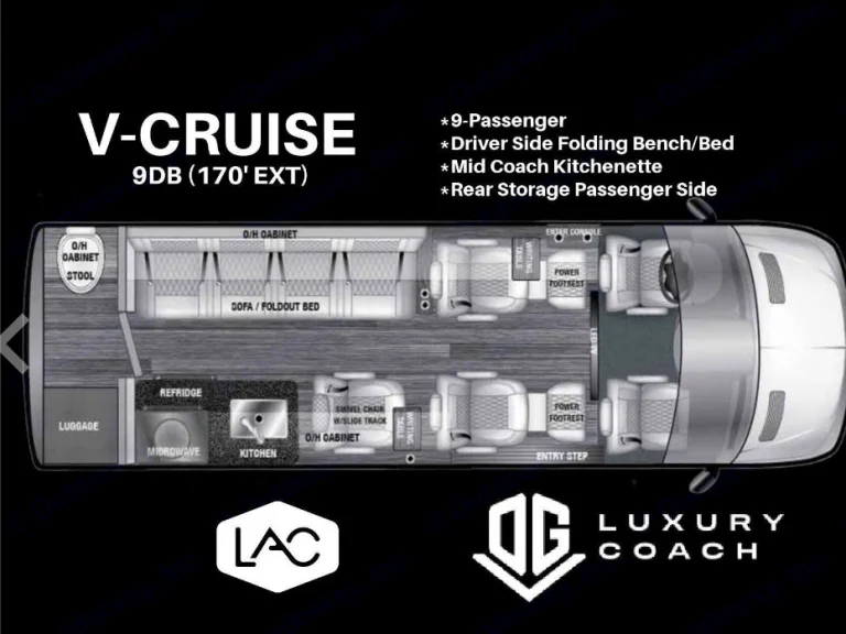 This is a 2025 OGV V Cruise sprinter van on a Mercedes Benz chassis. This van is built for traveling. Whether its long road trips or short weekend getaways, this van is ready to drive. With a diesel fueled powerhouse engine, you'll have no problem taking the family up mountains or across the plains to reach your destination in style. All of the captains chairs are heated and massaged (including the driver and passenger seats) so you can feel the next level of comfort while driving to your destination. With a capacity up to 9 people, you'll have no problem taking the family where you want to go. Also having a toilet on board will cut down the number of stops you'll have to make along the way! Enjoy traveling in the most comfortable vehicle with lots of room to stretch out in. Ce qui est inclus• Full water tank (30 gallons)