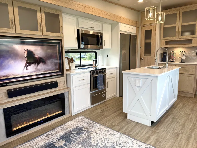 Unwind in the inviting rear living area, featuring a comfortable hide-a-bed sofa and cozy theater seating, all centered around an entertainment center complete with a fireplace and smart TV. Meal prepping is a breeze with the well-equipped kitchen with an island, and the booth dinette is perfect for enjoying meals together.The full bathroom features a spacious shower and a convenient linen closet to keep towels within easy reach. In the private owner’s retreat, you’ll wake each morning feeling refreshed in a king-sized bed with premium bedding. The room also offers plenty of storage for a comfortable, relaxing stay!——————————————————————Guests are responsible for reserving and paying for their campsite (not included in the rental). Please choose a site that accommodates a 35’ RV with three slides and full hookups (50-amp electric, water, and sewer). Once booked, share your reservation details with us and we’ll deliver, set up the camper, and provide a keyless entry code before your arrival. The only thing you have to do is arrive, relax, and enjoy your stay! :-)Recommended RV Campgrounds: