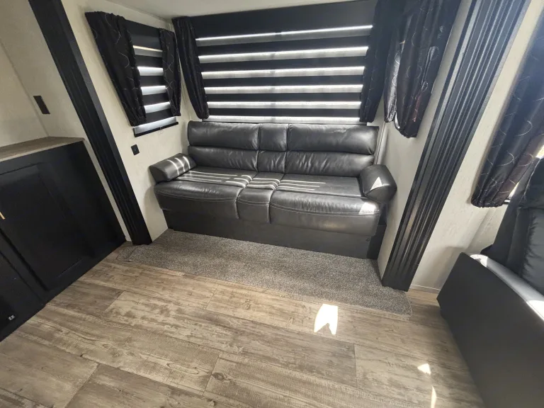 The fully equipped kitchen makes cooking on the road effortless. Featuring a spacious island for prep space, a three-burner stovetop, oven, microwave, and large refrigerator, you’ll have everything you need to prepare meals just like at home. Ample cabinet space and pantry storage allow you to stock up for longer trips. The kitchen is also stocked with cookware, dishes, utensils, cooking tools, and a coffee maker — so mornings at the campsite start right.Bedroom: