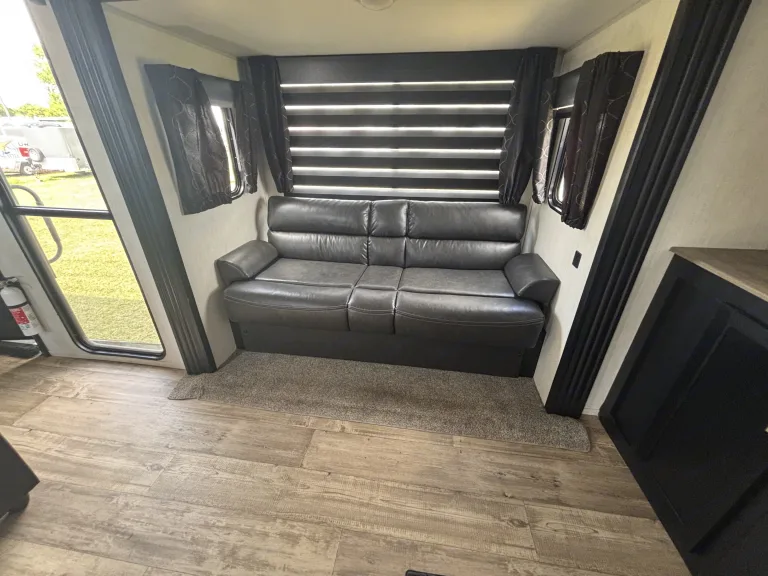 Enjoy the convenience of a full private bathroom featuring a spacious shower, toilet, and vanity with sink. No campground bathhouses required. Toilet paper and RV septic tabs are included for your convenience, so you can travel comfortably and worry-free.Exterior: