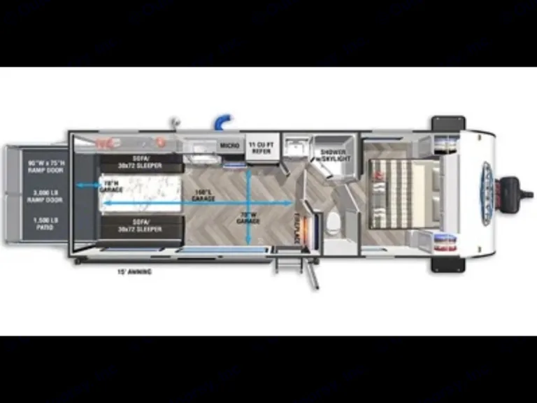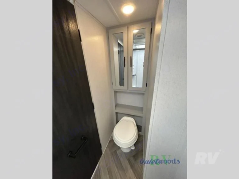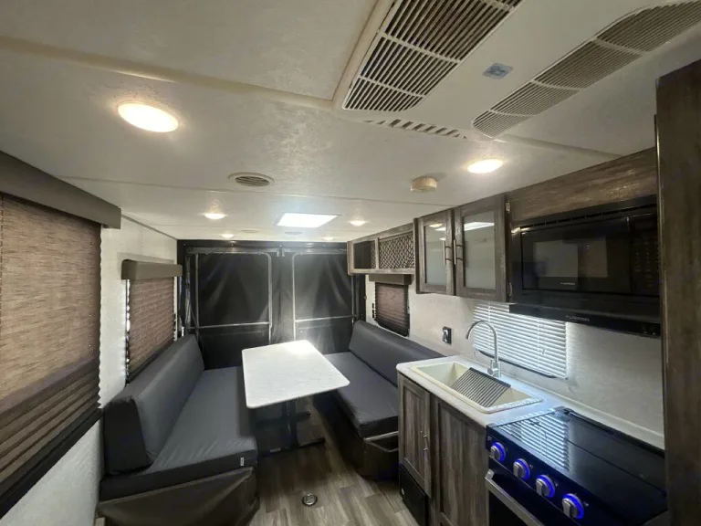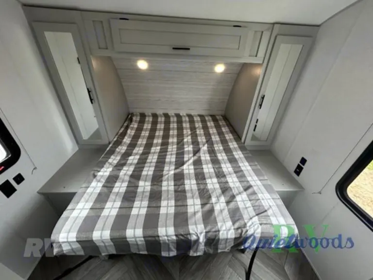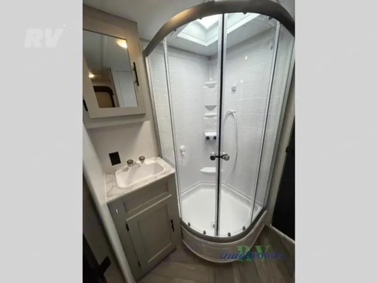 In the fully equipped kitchen you will find a three-burner range, a largest-in-class single basin sink, and a double-door refrigerator for your perishables. The walk-through bathroom has a radius shower with skylight where you can easily clean up after playing outside all day, and at night you can retreat to the private bedroom and get a good night's rest on the RV queen bed.