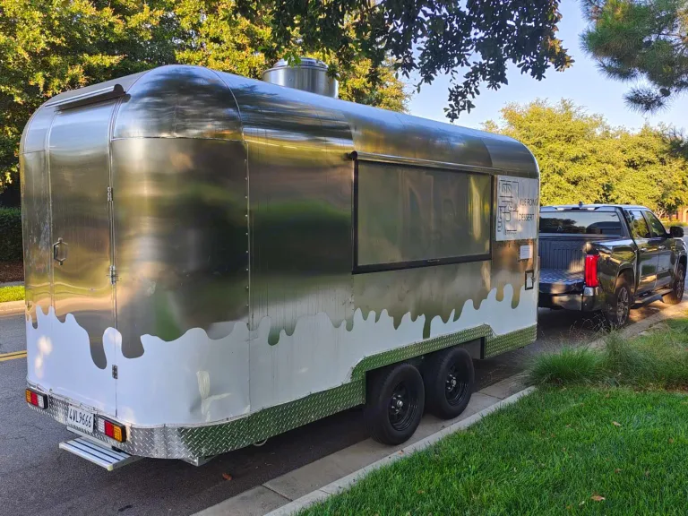 Take your outdoor cooking to the next level with this converted food trailer, now designed exclusively for camping and outdoor meal prep. Perfect for group trips, festivals, or tailgating – enjoy a fully functional kitchen on wheels wherever you go!Features:Fully equipped kitchen – counters, prep space, and storage for all your cooking needs.Water hookup ready – standard ¾” GHT connection, easy to attach at campgrounds.Power ready – compatible with campground shore power or generator.Durable & road-ready – built as a food trailer, tough for road trips and outdoor conditions.Ideal for gatherings – cook for family, friends, or groups during camping trips.Please note: This trailer is for cooking and food prep only. It does not include beds or sleeping accommodations.Make your camping trip unique and tasty with this mobile kitchen!Ce qui est inclus3 Compartment sink (Bowl 10"*14"*10")39" commercial merchandising door coolerNSF TZ™ two burner hotplate36" Commercial Radiant Broiler GrillPropane gas counter top fryerUndercounter refrigeratorWall mounted hand sinkCommercial kitchen hoodWaste water tank (Black)Exhaust fanWater heaterWater pumpFresh water tankAutres points à signalerThis trailer is not for sleeping.