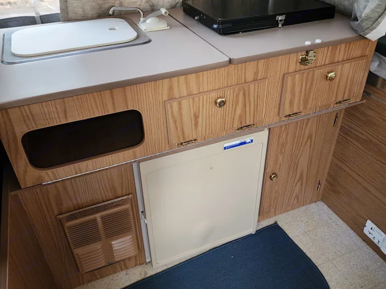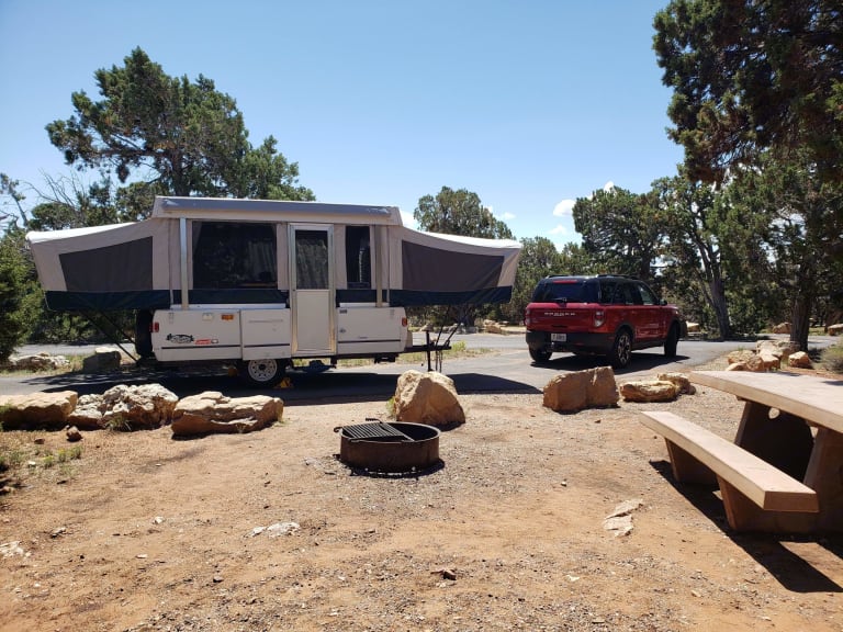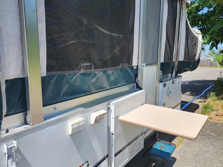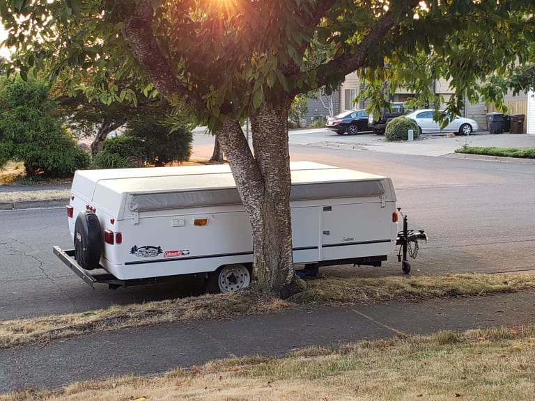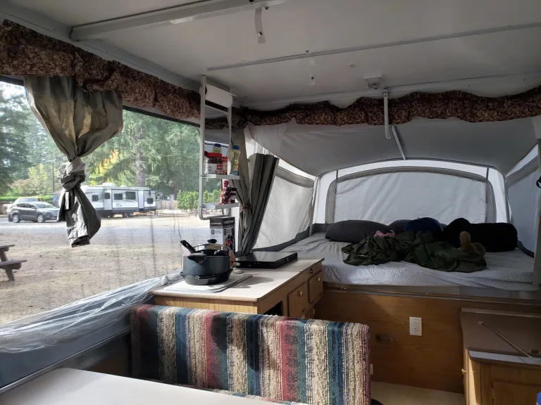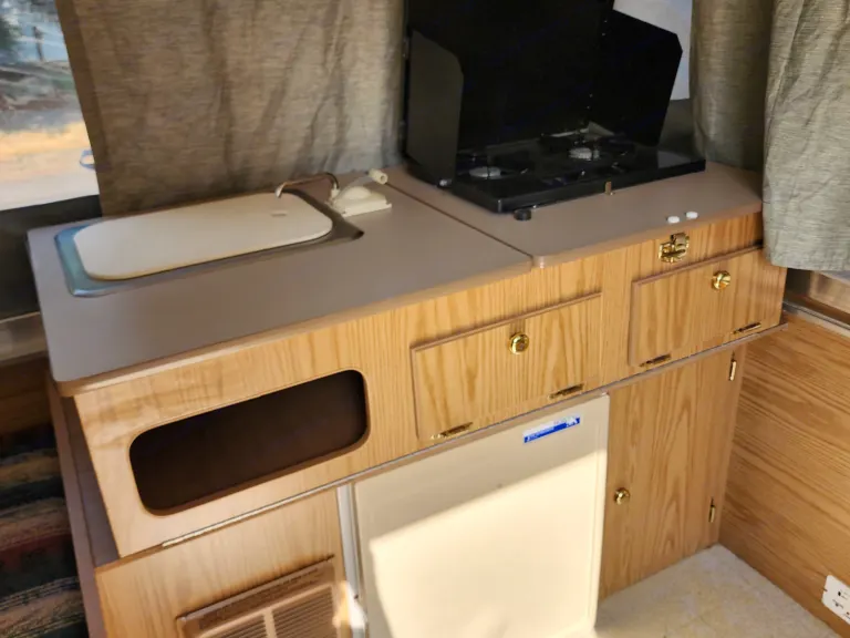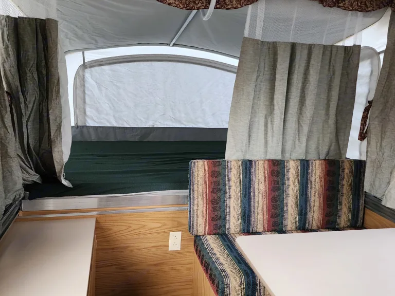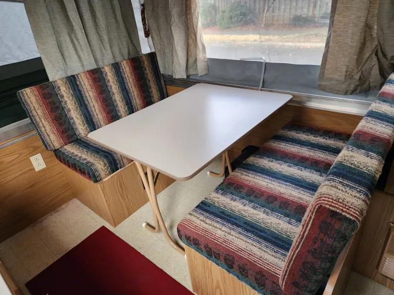 This is the trailer that made me fall in love with RVing. Pop-up camper stays nice and compact while towing, and opens up to sleep 5 once parked. Has both a Queen & Full beds that slide out as well as the dinette folding down for an additional sleeping spot. Small propane dinette with water hookup. Small fridge and furnace as well. Has 30 Amp electricity. This has been a great, easy and fun way to take my kids out exploring over the years and is the perfect size for a small family or group of friends. Its light weight and short height makes it easy to tow and park in campsites and really opens up options for many SUVs to tow. It may not have the luxuries of some larger RVs, but it's got charm! Ce qui est inclus• Rear & Front Tend End Beds