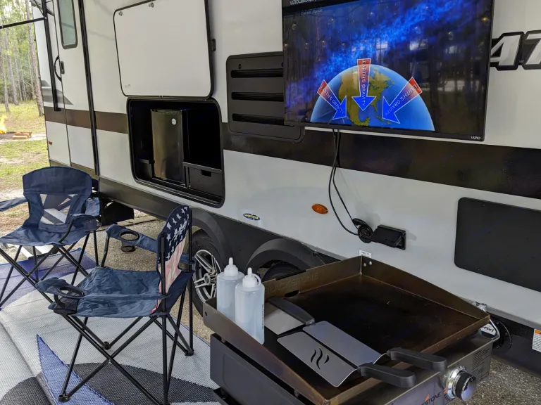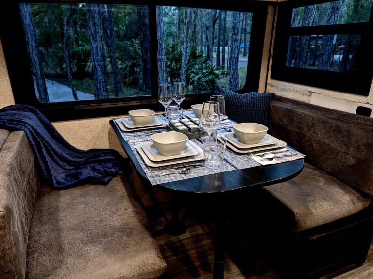 Breaking News Disney has changed their policy on RV rentals. Please contact me on how we can help provide an RV rental for you at DFW.We’re the Knowles Family, We love our camping adventures, and we hope we can help you do the same. Being a native Floridian I know a lot about it, and we enjoy all that Florida has to offer. Camping, Kayaking, Biking, hiking, beaches, lakes, slowly floating down a B.E.A.utiful Crystal clear spring river, Tailgating at a Pro (Go Bucs) or College (Go Gators) Football games, Music Festivals, golfing, fishing, Oh and Disney of course. One of my favorite memories of camping is the landscape of campfires in the early evenings and the smell of charcoal smoke floating through the campgrounds as all the campers are setting up for dinner…. I look forward to hearing about your favorite memories.Get out and experience new adventures and campgrounds, whether for 2 days or 2 weeks with this spacious travel trailer that offers a slide-out theater seating and booth dinette staging an area for relaxing and dining. Enjoy a little separation with split sleeping spaces. Front bedroom (Queen) with a pocket door for private and peaceful moments, dual (Full) bunkbeds in the back, pullout Sofa (Full) and the dinette breaks down to a bed (Full) as well as more interior floor space to move from the front to the back. The dual entries are a great feature as well when you have eight campers on your trip. And having the second entry/exit to the full bathroom is convenient for all. The chef will love making meals inside with full amenities or the grill master will enjoy the outside kitchen when shaded under the 21' power awning with LED lights covering both entries *Ideal for Florida’s Sun and Rain. Ce qui est inclusHelp us... Help you have a "Supercalifragilisticeexpialidocious" experience. You're welcome to contact us at anytime during the get-away planning. *Native Floridian here... I have vast knowledge of all Florida FUN! Oh and Disney of course.We will DELIVER, SET-UP, and SHOP FOR YOU! You will have all you need at your get-away destination.This Jayco Travel Trailer comes Fully Stocked, including: