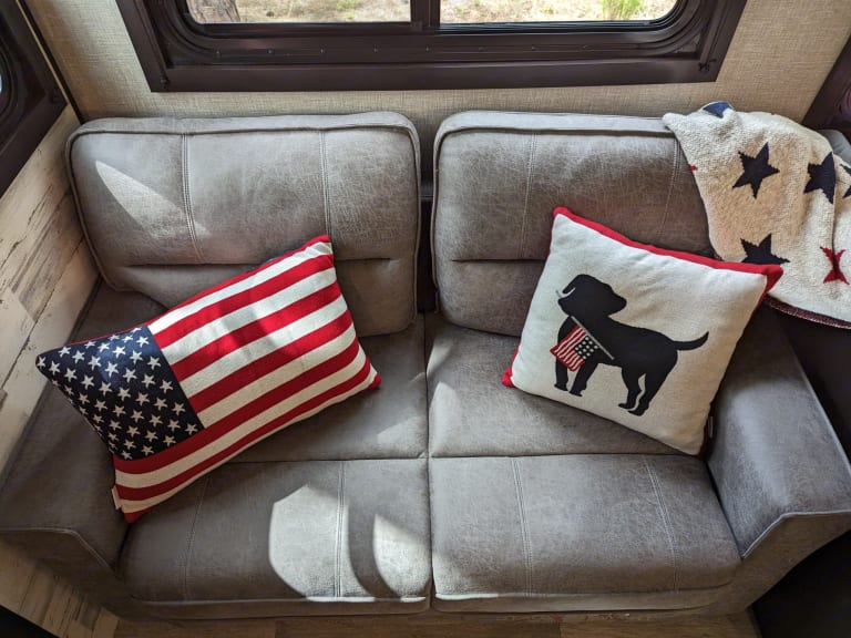 NO Smoking inside trailer. Please try not to let cigarette/cigar smoke drift inside the trailer through open doors as well.***We take pride in keeping our RV clean, fresh, and sanitized so that you can comfortably enjoy your vacation.***Due to the rising cost of fuel we had to increase our delivery/set-up fees slightly, contact us before booking to get the best delivery price.***Anything missing or damaged it will be deducted from the deposit.***If the camper is left dirty or Wet Dog smelly (other than the basic vacuum, linens change and dog hair), a $100 deep cleaning fee will be applied.***If the camper is picked up with cigarette or cigar smoke smell inside the renter will forfeit the $500 deposit and could be charged for a restoration service. Again please try not to let smoke drift inside the camper.
