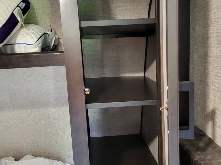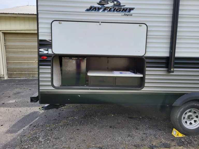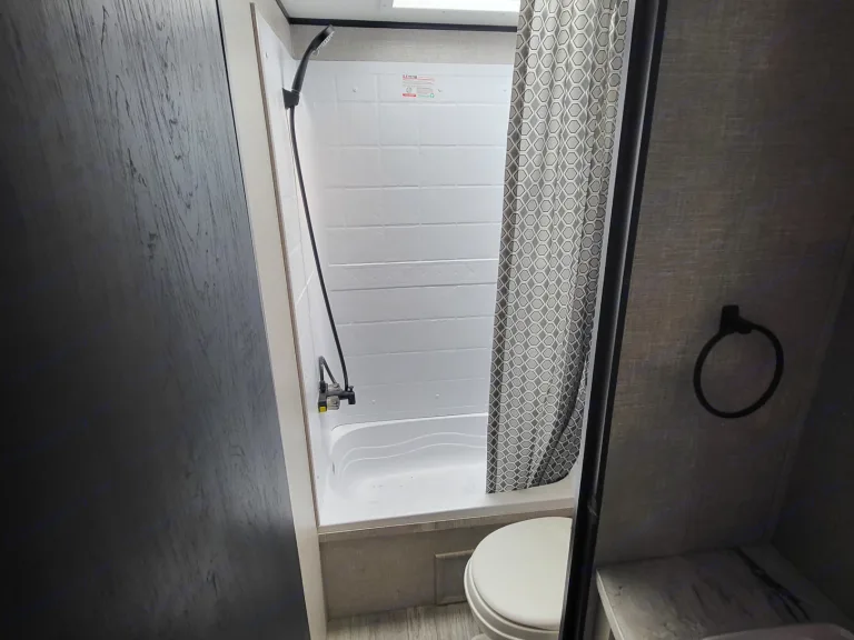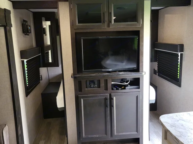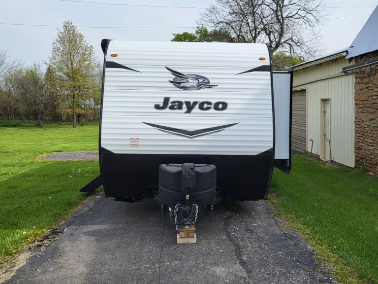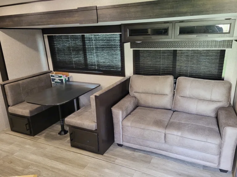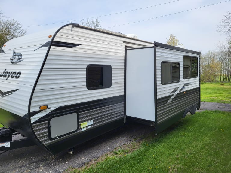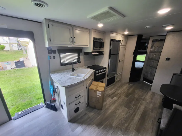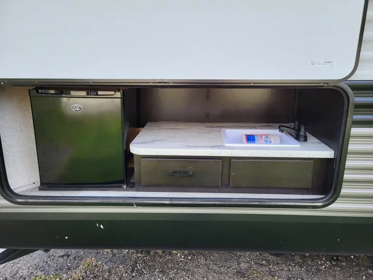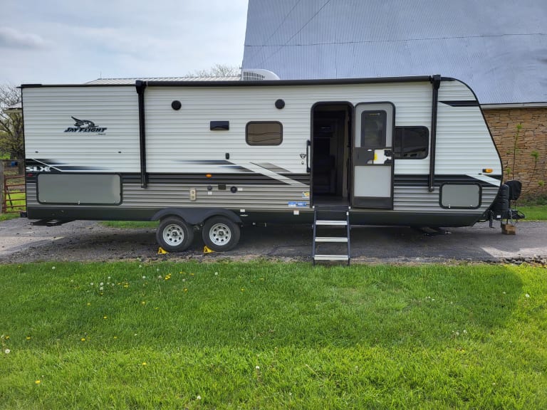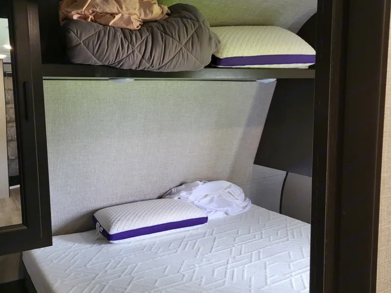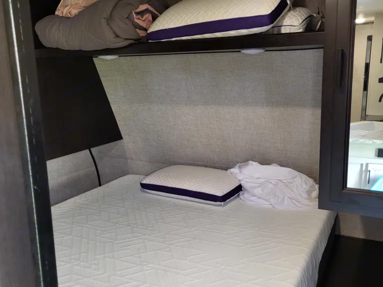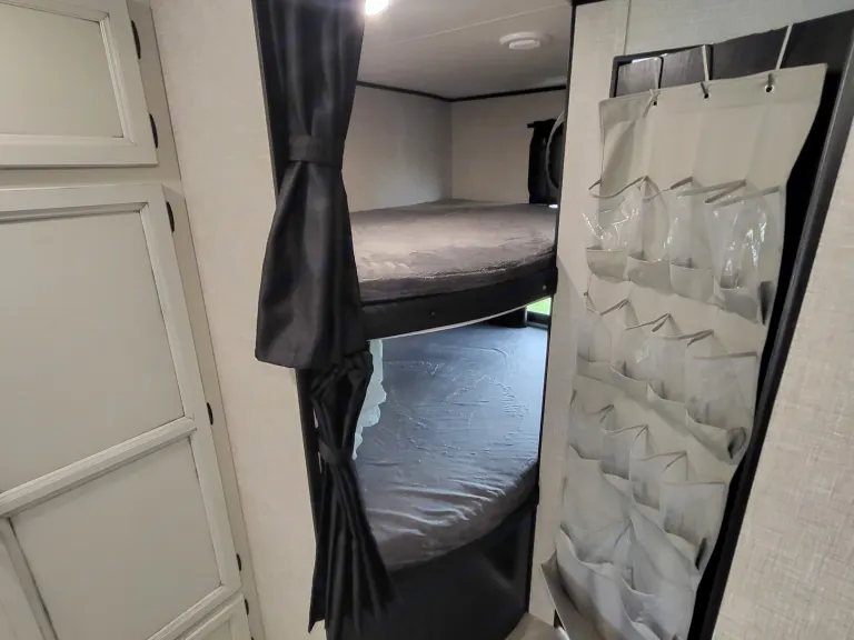 Spacious travel trailer with a front bedroom with an upgraded camper queen mattress. Couch easily turns into another bed with full size bunkbeds for the kids! Outdoor sink and miny fridge. Lots of cabinet storage for long trips. Great for large families.