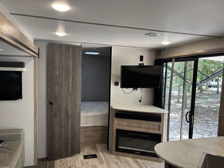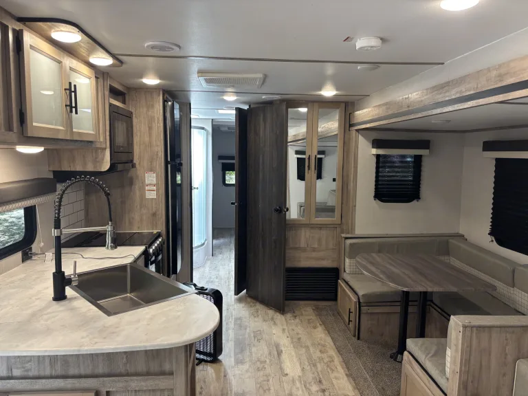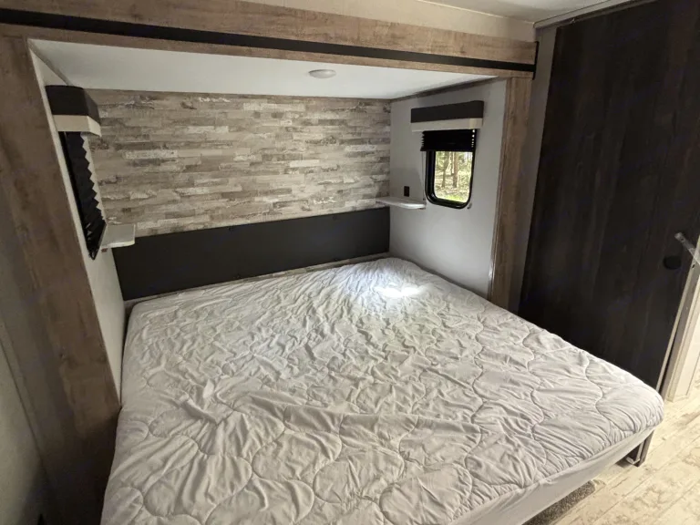 This camper is huge! And it’s great for two couples traveling together!You will love the convenience and privacy the separated bath provides.The master bedroom in the rear offers a king bed with a slide out and closet with drawers as well as the second entry door.When you're ready to wind down your nights, you can play a card game at the booth dinette or relax on the sofa and watch TV while the kids play.