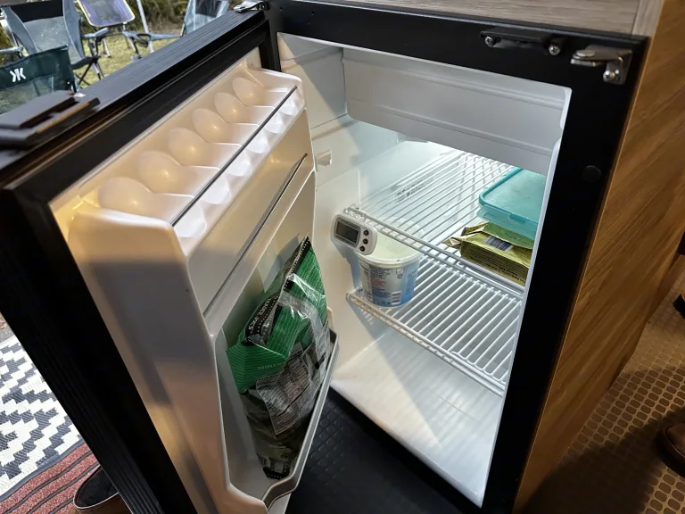 *12V cooler that plugs in (no ice needed!) and doubles as a center console while driving (see pics)