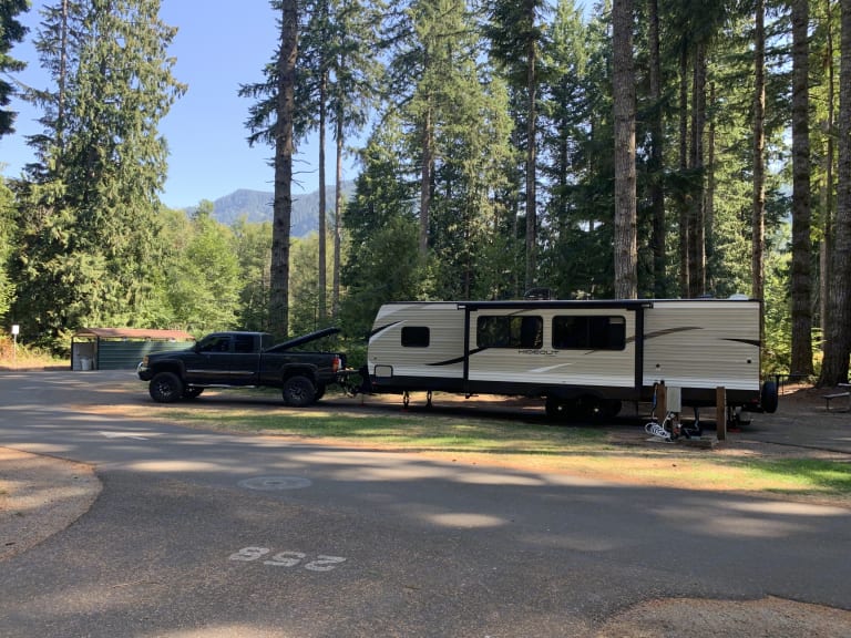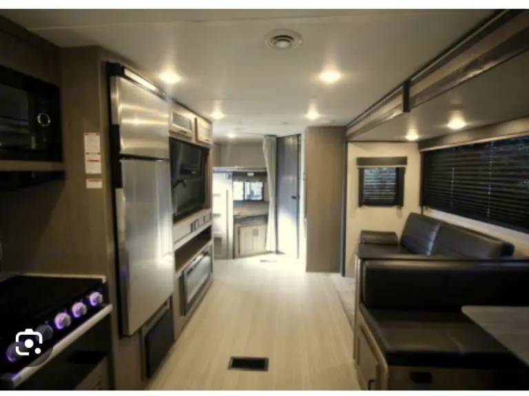 Spend your nights in this luxury keystone hideout with all the upgrades ! 2 fireplaces in and out, equipped with a queen-sized bed, double bunk bed, sink, induction stove, microwave, ventilation and heater. Tons of storage space underneath for all of your adventure gear!This rig is also jam-packed with high-end components. A furnace /water heater system, a/c central vac system and a full open wall designed pantry .sit down on the couch and enjoy the 55 inch flat screen with surround sound. Ce qui est inclusAll the basic essentials, propane , water and fuel. 2x camp chairs, camping table, linens cookware, utensils. available upon request.