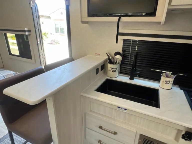 Stay entertained with an LED TV, Bluetooth stereo, and both indoor and outdoor speakers. For added comfort, the trailer includes air conditioning and a furnace.Electric stabilizer and tongue jacks make setup a breeze. Trailer comes fully stocked with fresh towels and fitted sheets, cookware, serving ware, cleaning supplies, and optional weight distribution hitch and sway control. Whether you’re planning a weekend trip or a longer adventure, our Cozy Cruiser is ready to make your getaway easy and enjoyable.Delivery available upon request!Ce qui est inclus • 400-watt rooftop solar panels