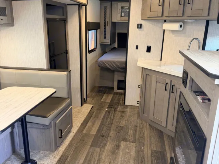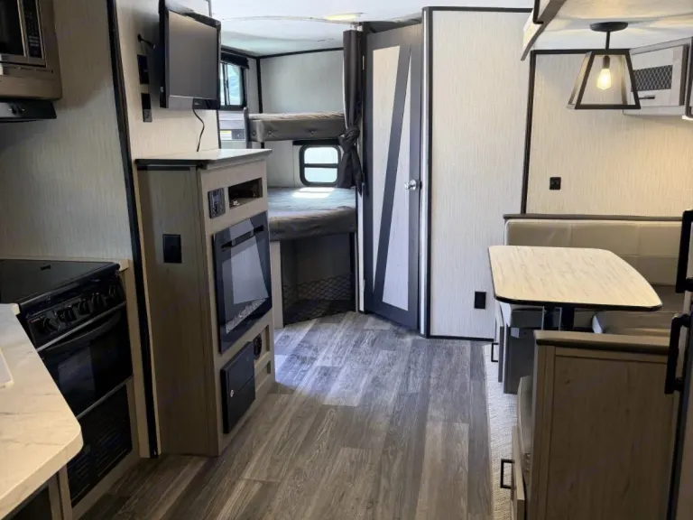 Hello! I have added a larger trailer to meet the needs of larger families or groups or if you just want more space! Has a separate room offering a king bed, 2 large bunks, and a large u shape table that also converts to a sleeping area if needed. Has a large pop out where the dining table is, a large bathroom with a big shower, a fireplace, TV and a larger sized fridge/freezer! Has a stove and also an oven. Large pantry area for storage and tons of storage throughout the trailer. Outdoor kitchen area. Please let me know if you have any questions, I’d love to help you have a wonderful camping experience!Autres points à signalerNo smoking of any sort inside ! Thanks for respecting this rule.
