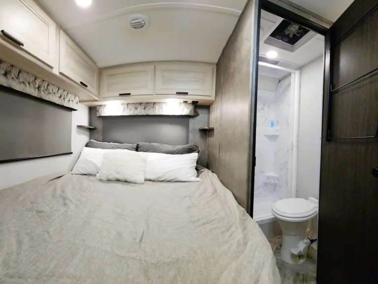 (Pillows and blankets not included— bedding package available for purchase)Keep the good energy (and meals) going with a full kitchen, including a refrigerator/freezer, microwave, and 3-burner gas stove—everything you need to fuel your festival days and nights.Inside the living space, you’ll find the dinette, a pull-out TV/DVD player (with a small stash of movies), and just enough room to hang out and unwind. There’s also a full bathroom with a shower, so you can rinse off the playa and start fresh each day.With central A/C and heat, Firefly keeps you cool when it’s blazing and warm when the temps drop—because comfort matters, even in the dust.Important Playa Note: