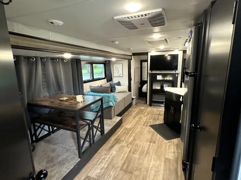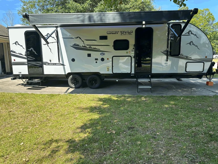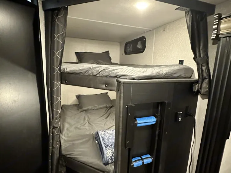 This new Grey Wolf Black Label comes with updated kitchen and new 2 seater couch. Bunk beds are roomy for more than one kid to sleep per bunk. Front end has a queen bed with two sliding doors for privacy. A tv along with a cozy electric fireplace are included. Grill outside with music and an outdoor fridge. Complete kitchen inside along with an oven and stove! 2 entry/exit points including a straightaway into the bathroom. Updated couch and dining table. Spacious and homey, you’ll love your camping getaway!Propane will always be full upon drop off! We do not charge a fee to refill.We do allow pets but ask that you do not leave them unattended inside the unit. Please do not allow them on the furniture.Delivery and pickup available within a 85 mile radius!Prep fee is required for sanitizing and cleaning the unit after cleaning.Ce qui est inclusLinens and towels are included along with kitchen utensils. Keurig and a ninja air fryer will also be available! We will also have outdoor table and a Blackstone griddle to cook on. 4 camping chairs will be located in the storage compartment along with an outdoor rug!RecommandationsJust bring your own food, beverages, personal necessities and you're ready to camp!Autres points à signalerWe expect to receive the camper back in the condition it was picked up/dropped off in. No dirty dishes, please. We’ll take care of the laundry! Please don’t rearrange anything within the camper.