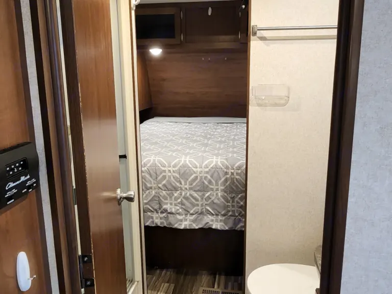 This travel trailer has an upgraded queen size bed in its own ensuite. With two TVs for entertainment while you relax. One in the bedroom and one in the main cabin area. It also has two A/C units to keep cool. Finally, the inadequate outer stove has been removed which provides for greater storage.
