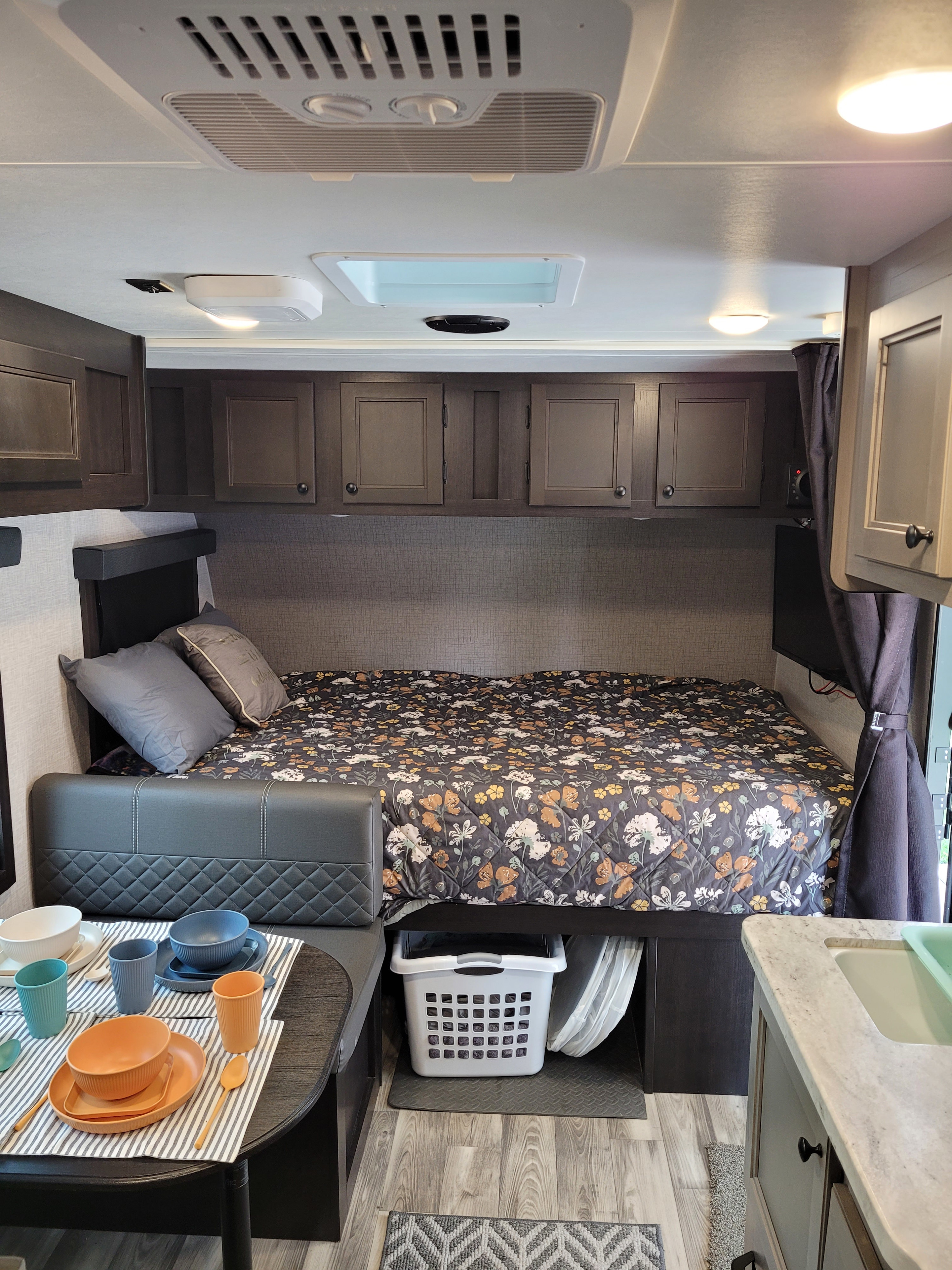 Perfect size for us. Marc was amazing with communication. Grandkids loved the bunk beds with pouches to hold items and lights. Well stocked with games and blankets. We did bring along some of our favorite plates, silverware and cooking supplies. Large refrigerator and freezer a big bonus. Super clean. Cannot say enough about Marc he was so helpful and accommodating.