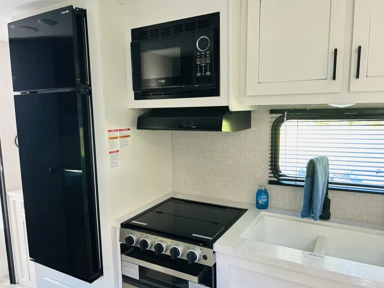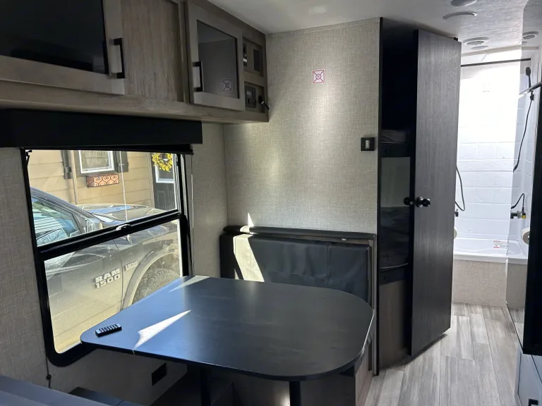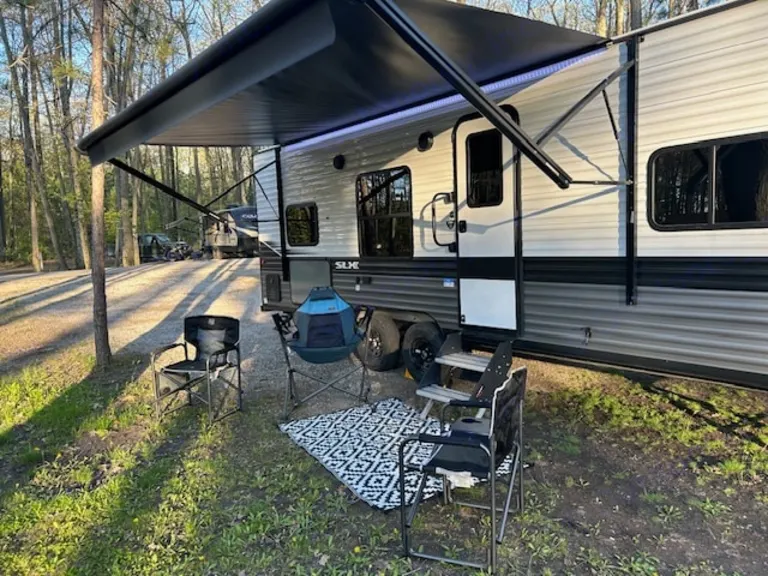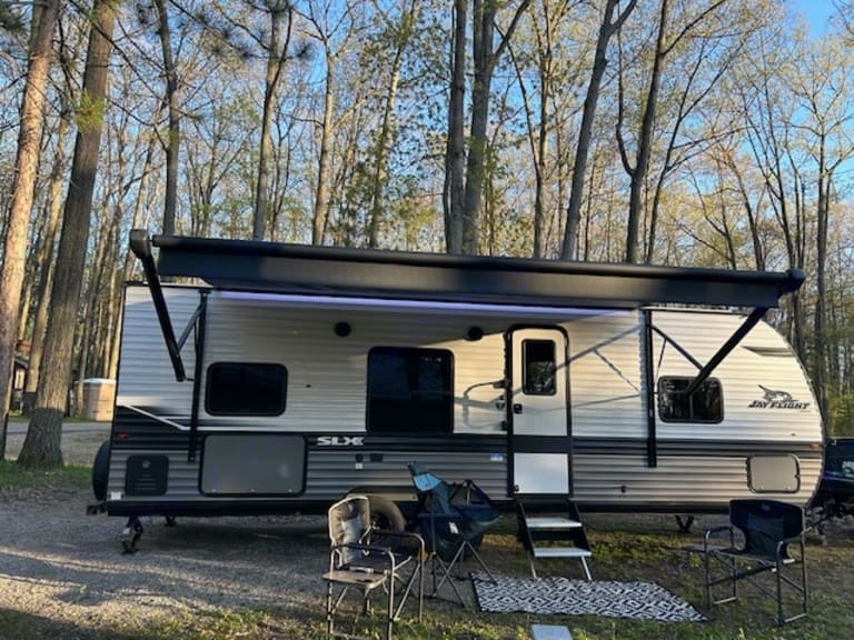 Our Jayco Jay Flight is new! It's 29.5 ft, super clean and ready for your adventure!With a queen size bed, a couch and table that each turn into beds and two bunks it sleeps up to 10. There is great storage, a stove and oven, double sink, microwave , fridge and freezer. The bathroom is spacious with a shower/tub and sink that allows for easy movement.There is a tv, blue tooth enabled am/fm radio, speakers in and outside and both standard and usb outlets. We have an on-demand hot water heater, furnace and air conditioning, windows and vents for great views and air circulation.Ce qui est inclusIncluded with the rental is full kitchen equipment and supplies including a 12 cup coffee maker, pots & pans. Kitchen & bath towels, cleaning supplies, starter supplies of tp and paper towels, and toilet chemicals.