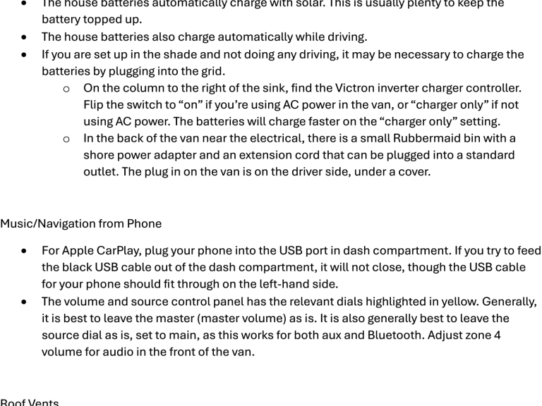 The house batteries automatically charge with solar and while driving keeping the batteries topped up. If you are set up in the shade and not doing any driving, it may be necessary to charge the batteries with shore power/AC power. I supply a shore power adapter and extension cord to allow you to charge the house batteries via a standard outlet if needed. The van has a large fresh water tank, so no need for water hookup. Sewage hookup not applicable.
