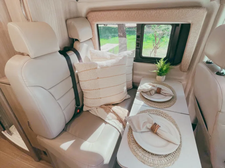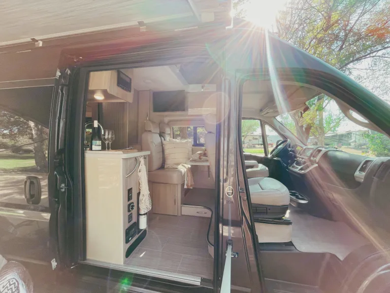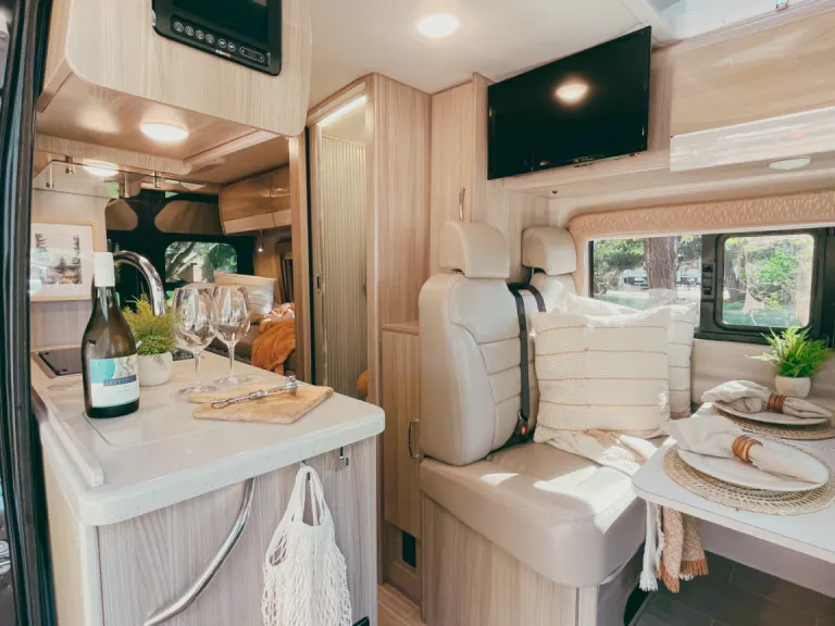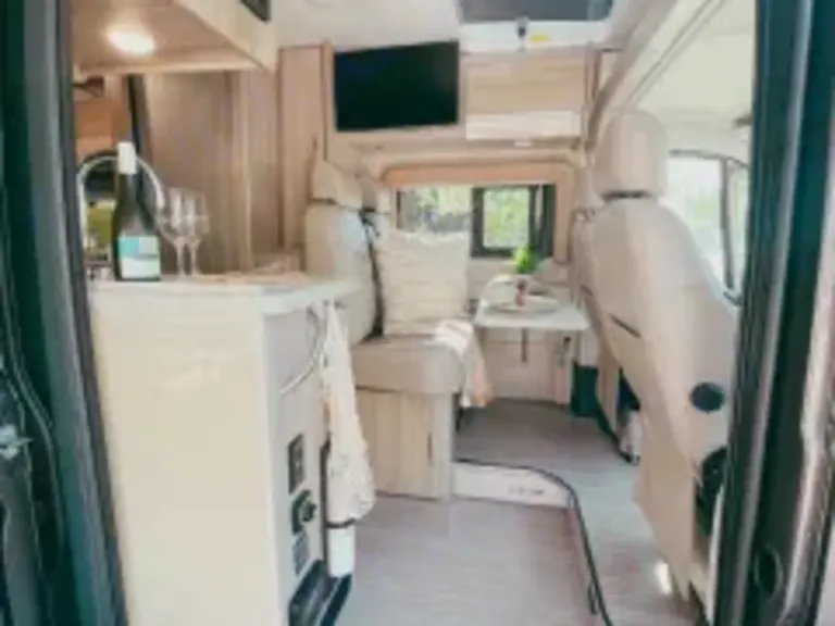 La Foret won't lead you astray"Go out in the woods, go out." - Clarissa Pinkola EstesIf you're someone who is always up for adventure but doesn't want to leave luxury behind, look no further! La Foret Adventure Van boasts the perfect balance between camping and glamping and will take you on a road trip you'll remember forever and ever, amen. La Foret Adventure Van is a 2021 Thor Sequence camper van ready to cruise the coast, frolic in the forest, or head for the hills. Hop into this haute hotel on wheels!La Foret drives smoothly and can comfortably seat and sleep up to four posh peeps. Sounds like it's time for a fancy family vancation! There are two twin-size beds in the back that can also become one big king-size bed instead. And the pop-top adds a queen-size bed up top, ideal for two kiddos or adventurous adults.Thanks to shore power hookups, solar panels, lithium batteries, and a generator, you have the power to go anywhere! Stay cool and comfortable with on-board air conditioning or turn on the built-in propane heater to warm you up if the temps turn chilly.