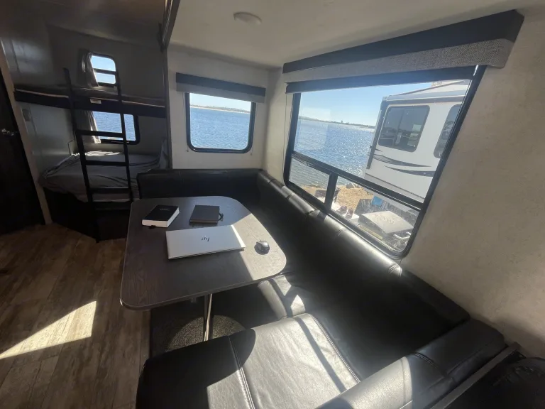 Imagine stepping into a beautifully designed 2022 Sale Cruise Lite RV, where the comforts of home meet the great outdoors. This stunning RV is equipped with all the essential amenities to ensure a perfect camping experience while immersing yourself in nature. Picture a cozy living area with plush seating, a modern kitchen featuring a refrigerator, stove, and microwave, and a bathroom complete with a shower—everything you need for a comfortable stay in picturesque surroundings.The spacious layout allows for plenty of room to relax and unwind after a day of adventure. Large windows invite the natural light in, offering breathtaking views of trees, mountains, or lakes right outside your door. You can enjoy your morning coffee on the patio or wind down with a glass of wine under a starlit sky, all from the peace of your home-away-from-home.Ce qui est inclusI will provide delivery, setup, cleaning, dumping, and pick-up, so all you need to do is show up and enjoy your getaway. With us taking care of the logistics, you can focus on creating unforgettable memories. In addition to the RV rental, we're thrilled to provide two synthetic grass carpets and a beautiful wooden table with chairs for your outdoor dining needs. We will also provide you with clean bed sheets, blankets, towels, toilet paper, and all the essentials for the kitchen.