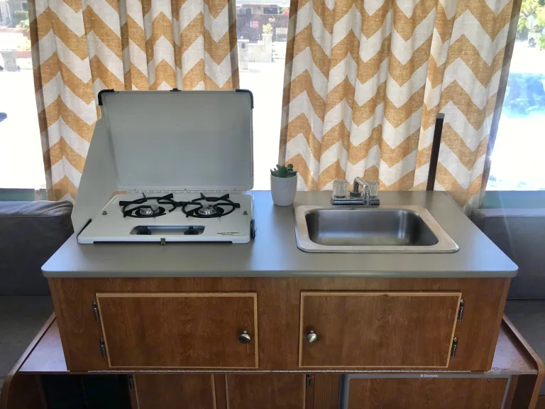 - 1 sofa that converts to a twin bedThe kitchenette is equipped with a stove, a mini-refrigerator, and a sink.The trailer was recently remodeled and has new flooring, new cushions, and new curtains. Ce qui est inclus- Fresh linens/pillows/blankets