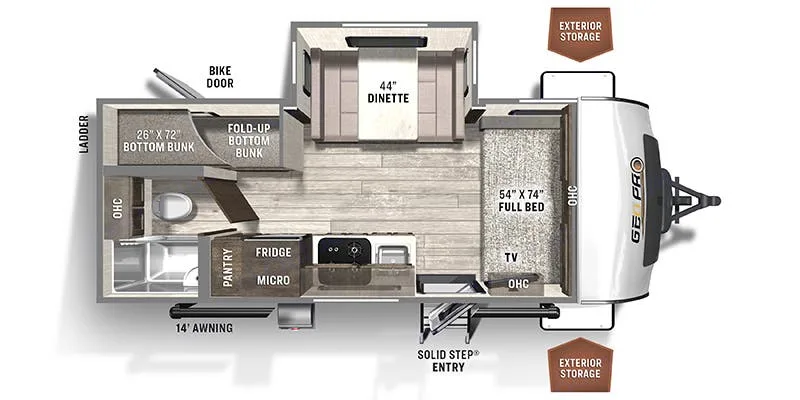 The Geo Pro is a 21 foot bunk house which is perfect for a small family or small group trip. Don't let the size fool you, with the slide out, this spacious trailer can sleep up to 5 people (2 on the queen mattress, one on each of the bunks, and the dining table converts into a small bed enough for 1). It has all the typical things you would expect from a trailer such as heat, AC, hot water, fridge, 3 burner stove, oven, microwave, bathroom with shower and small tub for children, and outdoor shower just to name a few.Linens are available for an extra fee. A generator can also be provided for an extra fee if boon docking or when full hookups are not available. Renter will be responsible to dump the black and grey tanks. There is a $60 dumping fee that can be paid upfront or after the trip for us to dump the black and grey tanks.What’s included?