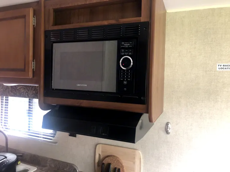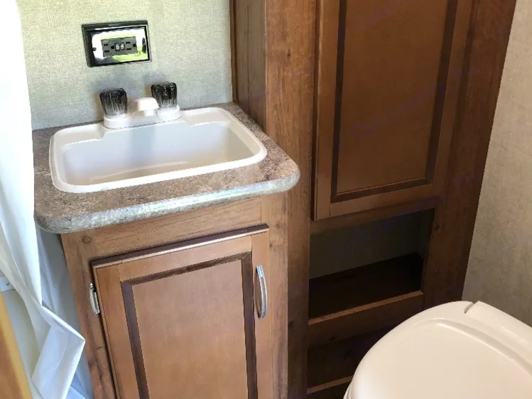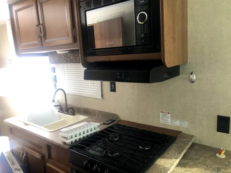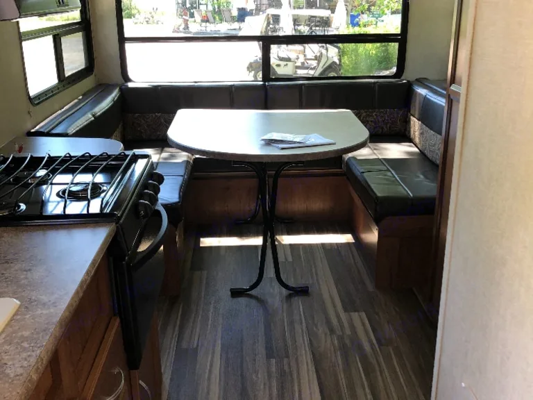 It features a queen size walk around bed with mattress topper. The large freestanding table folds down to sleep an additional 2people (best good for kids) The fridge is medium size with freezer. , stove with oven, microwave, double sink.